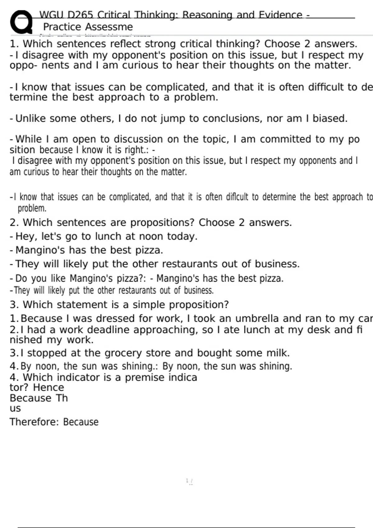 WGU D265 Critical Thinking: Reasoning and Evidence - Practice Assessmen