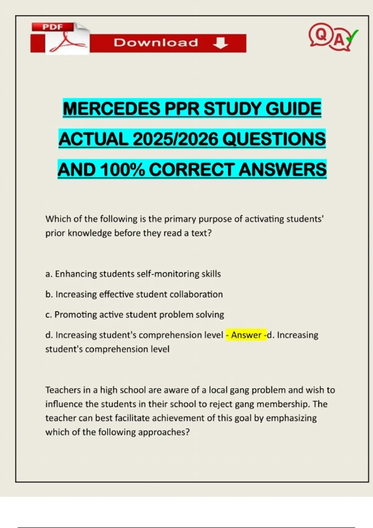 MERCEDES PPR STUDY GUIDE ACTUAL 2025/2026 QUESTIONS AND 100% CORRECT ANSWERS Which of the following is the primary purpose of activating students' prior knowledge before they read a text? a. Enhancing students self-monitoring skills b. Increasing effective student collaboration c. Promoting active student problem solving d. Increasing student's comprehension level - Answer -d. Increasing student's comprehension level Teachers in a high school are aware of a local gang problem and wish to influence the students in their school to reject gang membership. The teacher can best facilitate achievement of this goal by emphasizing which of the following approaches?Need assistance on Online classes, Exams & Assignments? Reach out for instant help!! Full Course Assistance, Plagiarism-free Essay Writing, Research Paper, Dissertation, Discussion Posts, etc…. Confidential & Secure services. Tutors are available for all subjects! Email now at: a. Ensuring that all students have access to information from reports, new articles and other credible sources that objectively examine gang membership. b. Creating a learning environment where students feel a sense of belonging and have opportunities to experience success c. Leading a discussion into their own classrooms aimed at examining the various causes of individuals' decisions to join a gang. d. Establishing systems and procedures in each class that emphasize teacher flexibility regarding expectations for student behavior and learning - Answer -c. Leading a discussion into their own classrooms aimed at examining the various causes of individuals' decisions to join a gang. A 4th grade teacher is planning a unit on weather. Students will record temperature, daily weather conditions etc. Using data recorded in the charts the students will create web-based broadcasts of the weather. To complete the project, the teacher will divide the class into groups. a. forecast team who analyze and complies students' predictionsb. a script writing team who writes the actual broadcast script c. a technology team who films the broadcast d. a design team who creates the set - Answer -a. forecast team who analyze and complies students' predictions which of the following types of assessment does the broadcast best illustrate a. reflective b. diagnostic