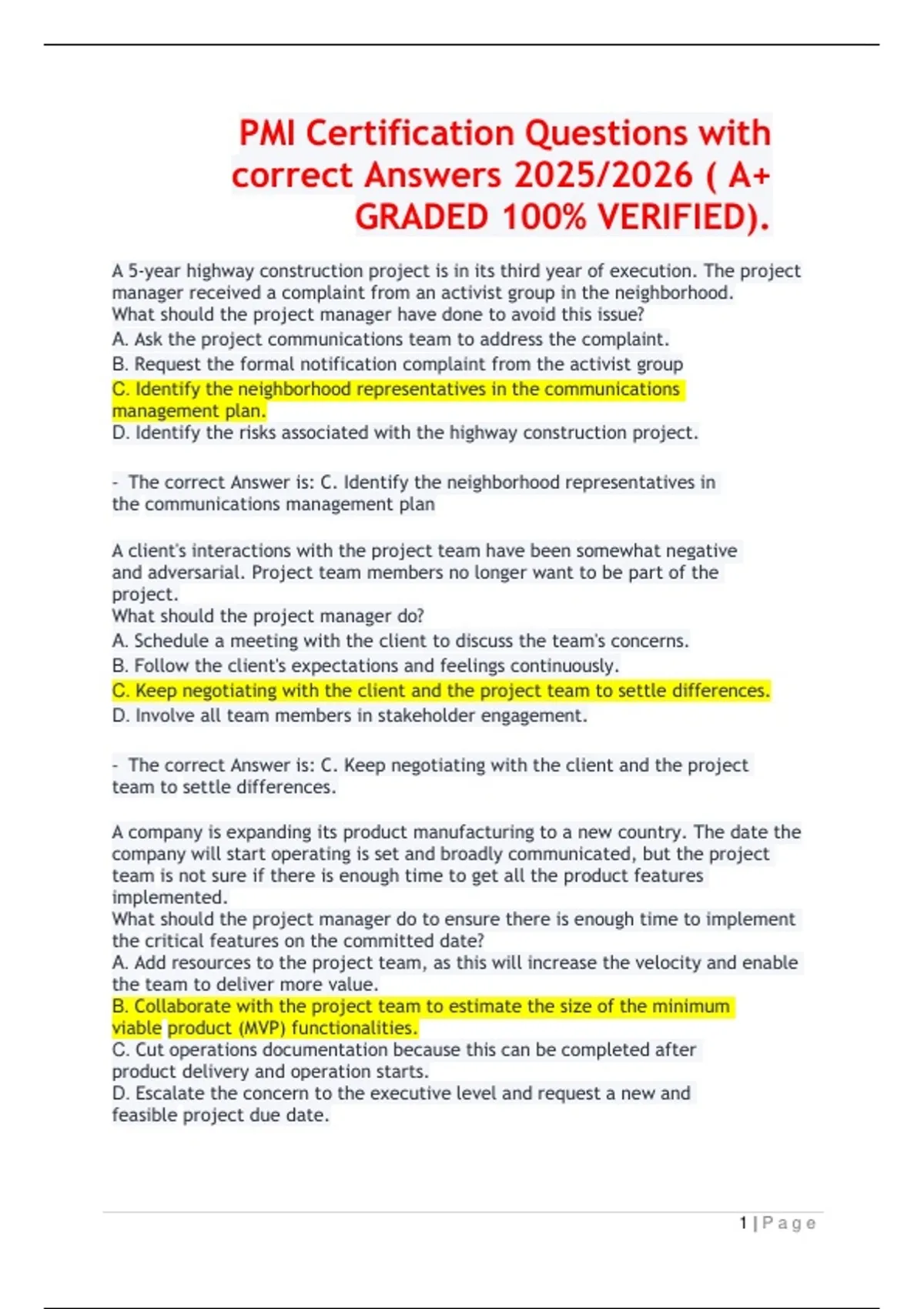 PMI Certification Questions with correct Answers 2025/2026 |A+ GRADED|