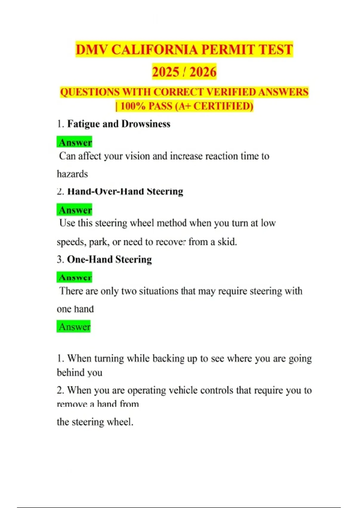 DMV CALIFORNIA PERMIT TEST 2025 / 2026 QUESTIONS WITH CORRECT VERIFIED ANSWERS | 100% PASS (A+ CERTIFIED) 1. Fatigue and Drowsiness Answer Can affect your vision and increase reaction time to hazards 2. Hand-Over-Hand Steering Answer Use this steering wheel method when you turn at low speeds, park, or need to recover from a skid. 3. One-Hand Steering Answer There are only two situations that may require steering with one hand Answer 1. When turning while backing up to see where you are going behind you 2. When you are operating vehicle controls that require you to remove a hand from the steering wheel. 4. If your signal lights are not functioning or bright sunlight makes signal lights hard to see Answer Use the hand-and-arm signals 5. Bicyclists may signals turn Answer With their arm held straight out pointing in the direction they plan to turn. 6. You should signal Answer At least 100 feet before you turn 7. You should signal Answer Before every lane change 8. You should signal Answer At least five seconds before you change lanes on a freeway 9. You should signal Answer Before pulling next to the curb or away from the curb 10. It is illegal for a person 21 years of age or older to drive with a blood alcohol concentration (BAC) that is ________ or higher Answer 0.08% -- Eight hundredths of one percent 11. California's "Basic Sped Law" says you must Answer Never drive faster than is safe for current conditions 12. Driving under the influence of any medication which impairs your driving is permitted Answer Under no circumstances 13. You may drive a motor vehicle in a bike lane Answer No more than 200 feet before making a right turn 14. If your cell phone rings while you are driving and you do not have a hands-free device, you should Answer Let the call go to voicemail 15. A solid yellow line next to a broken yellow line means that vehicles Answer Next to the broken line may pass 16. You want to park uphill on a two-way road and there is no curb. Which direction do you turn your front wheels? Answer Right, toward the side of the road. 17. You are involved in a minor collisions at an intersection. There are no injuries and there is very little vehicle damage. You should Answer Move your vehicle out of the traffic lane, if possible. 18. Smoking inside a vehicle with a person younger than 18 years of age is Answer Illegal at all times. 19. If there is no crosswalk and you see a pedestrian crossing your lane, you should Answer Stop and let the pedestrian finish crossing 20. You are driving on the freeway behind a large truck. You should drive Answer Farther behind the truck than you would if following a passenger vehicle 21. You must yield to a pedestrian using a white cane or guide dog Answer At all times 22. To see vehicles in your blind spots, you should check Answer Over your shoulders