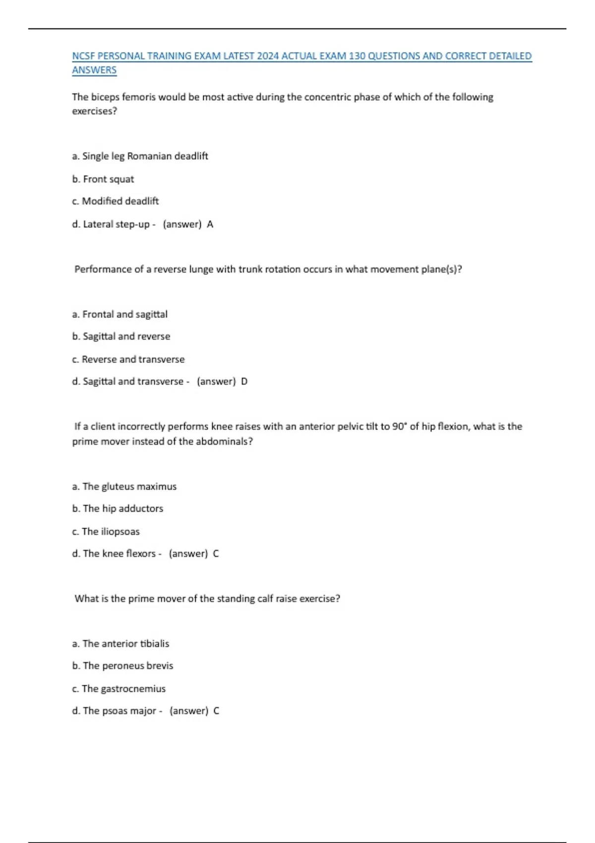 , NCSF PERSONAL TRAINING EXAM LATEST 2024 ACTUAL EXAM 130 QUESTIONS AND CORRECT DETAILED