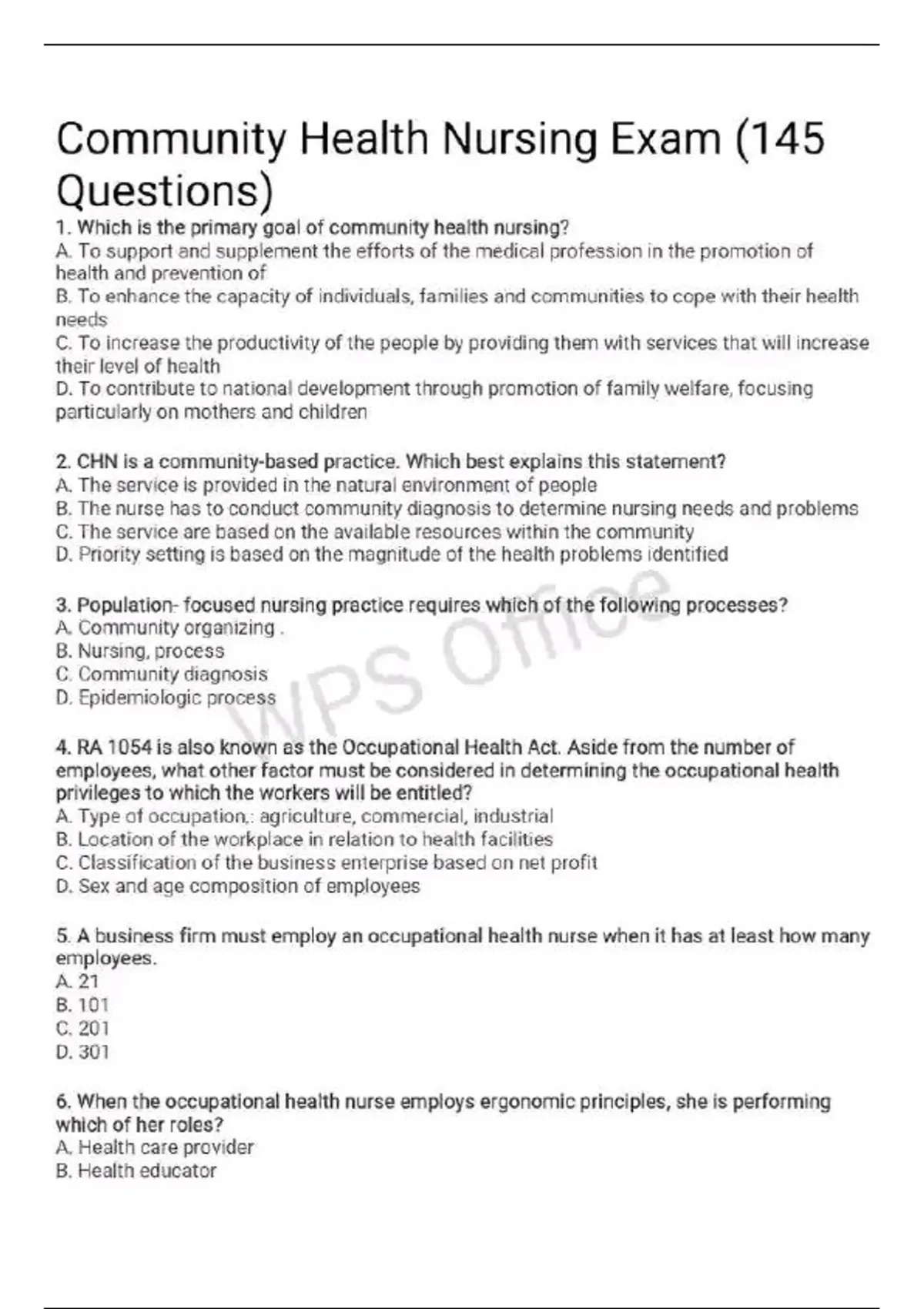 Community Health Nursing Exam 145 Questions And Answers Answer Key At The End