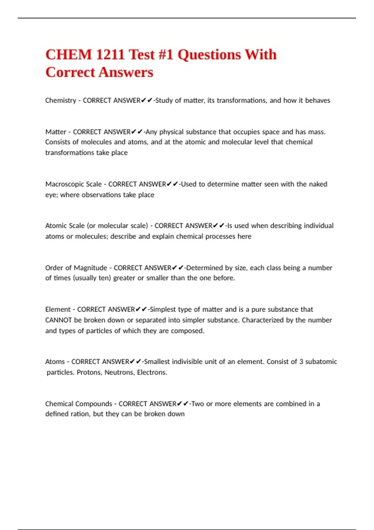 Chemistry |- |CORRECT |ANSWER✔✔-Study |of |matter, |its |transformations, |and |how |it |behaves