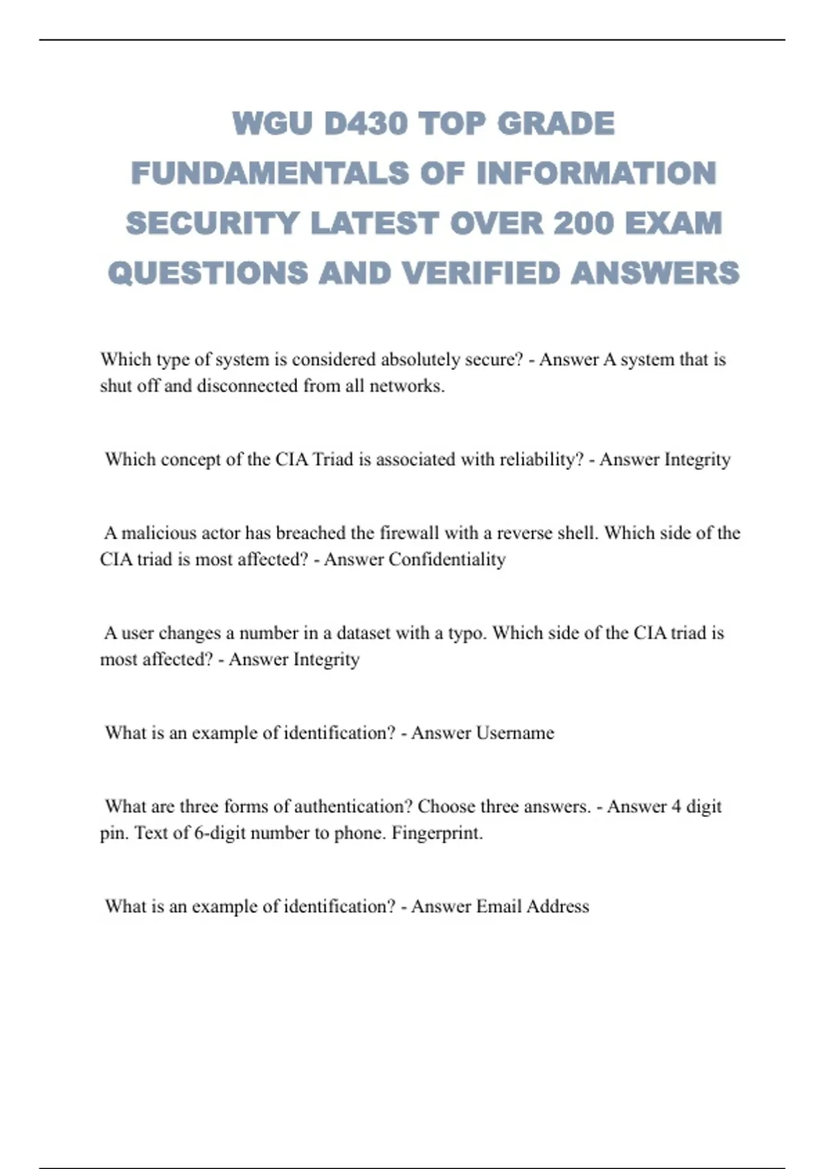 WGU D430 TOP GRADE FUNDAMENTALS OF INFORMATION SECURITY LATEST OVER 200 EXAM QUESTIONS AND VERIFIED ANSWERS
