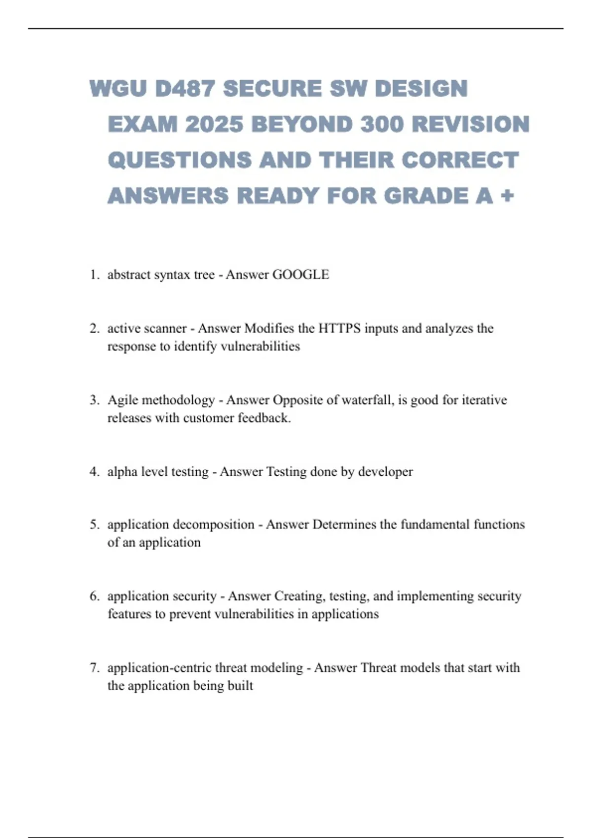 WGU D487 SECURE SW DESIGN EXAM 2025 BEYOND 300 REVISION QUESTIONS AND THEIR CORRECT ANSWERS READY FOR GRADE A +
