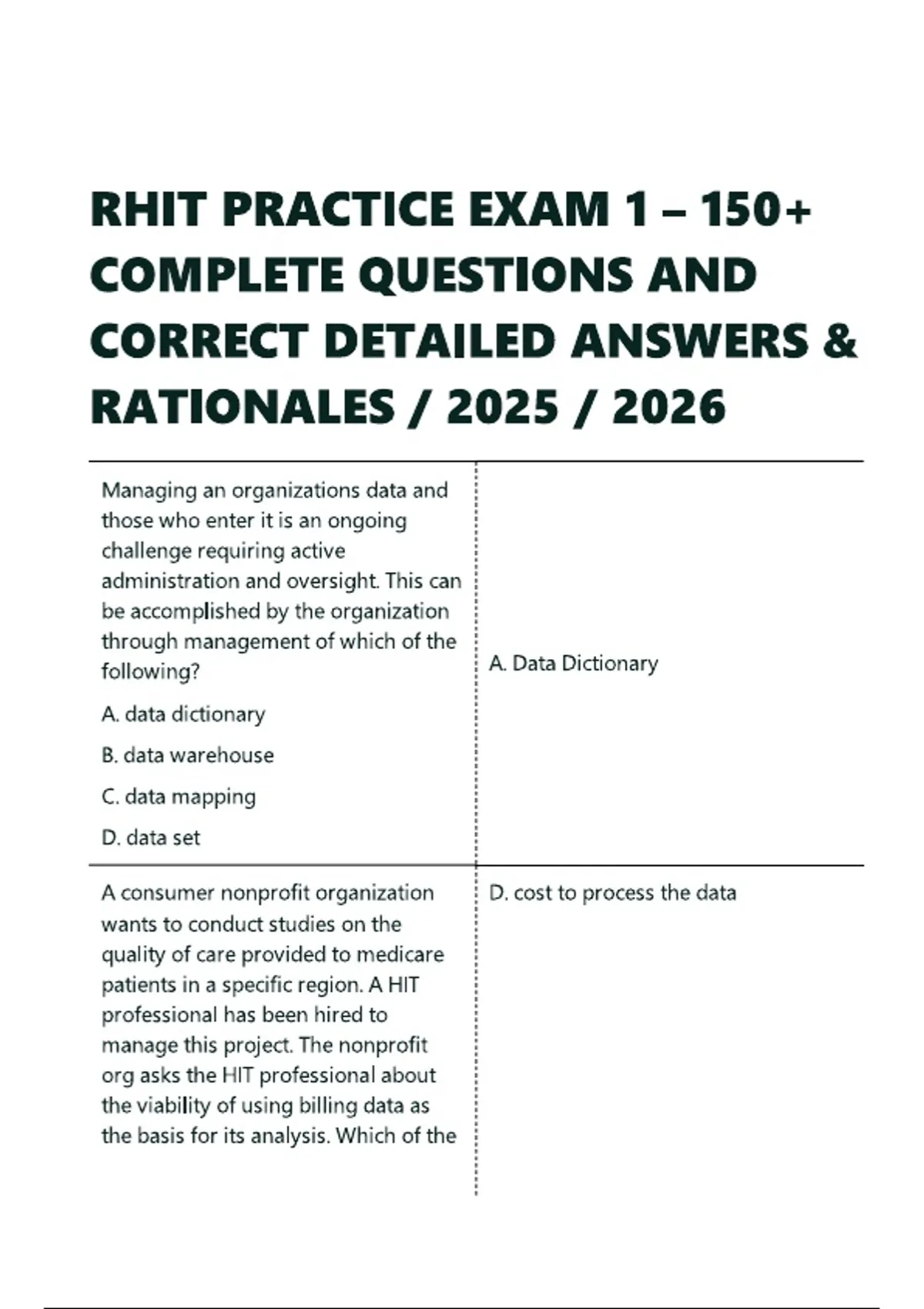 RHIT PRACTICE EXAM 1 – 150+ COMPLETE QUESTIONS AND CORRECT DETAILED ANSWERS & RATIONALES / 2025 / 2026