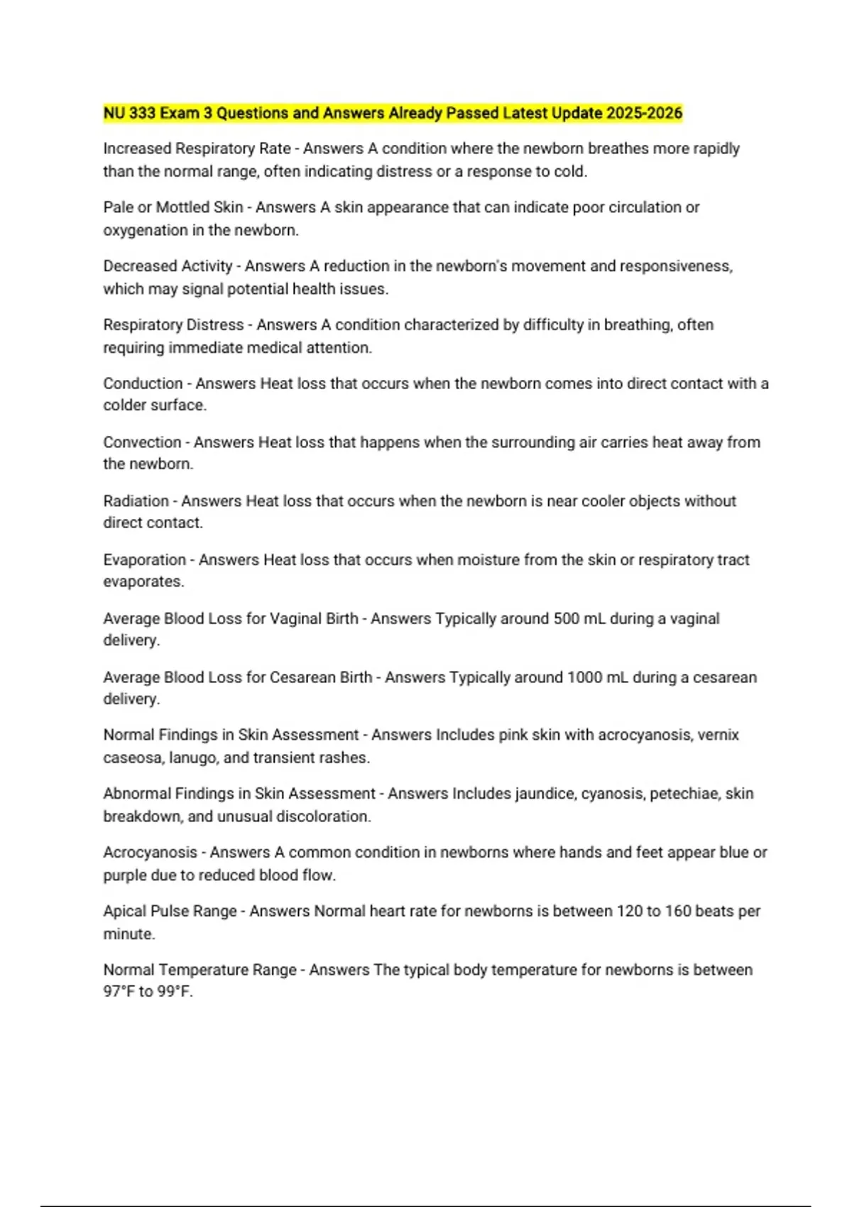 APGAR Score - Answers A quick assessment of a newborn's health based on Appearance, Pulse,
