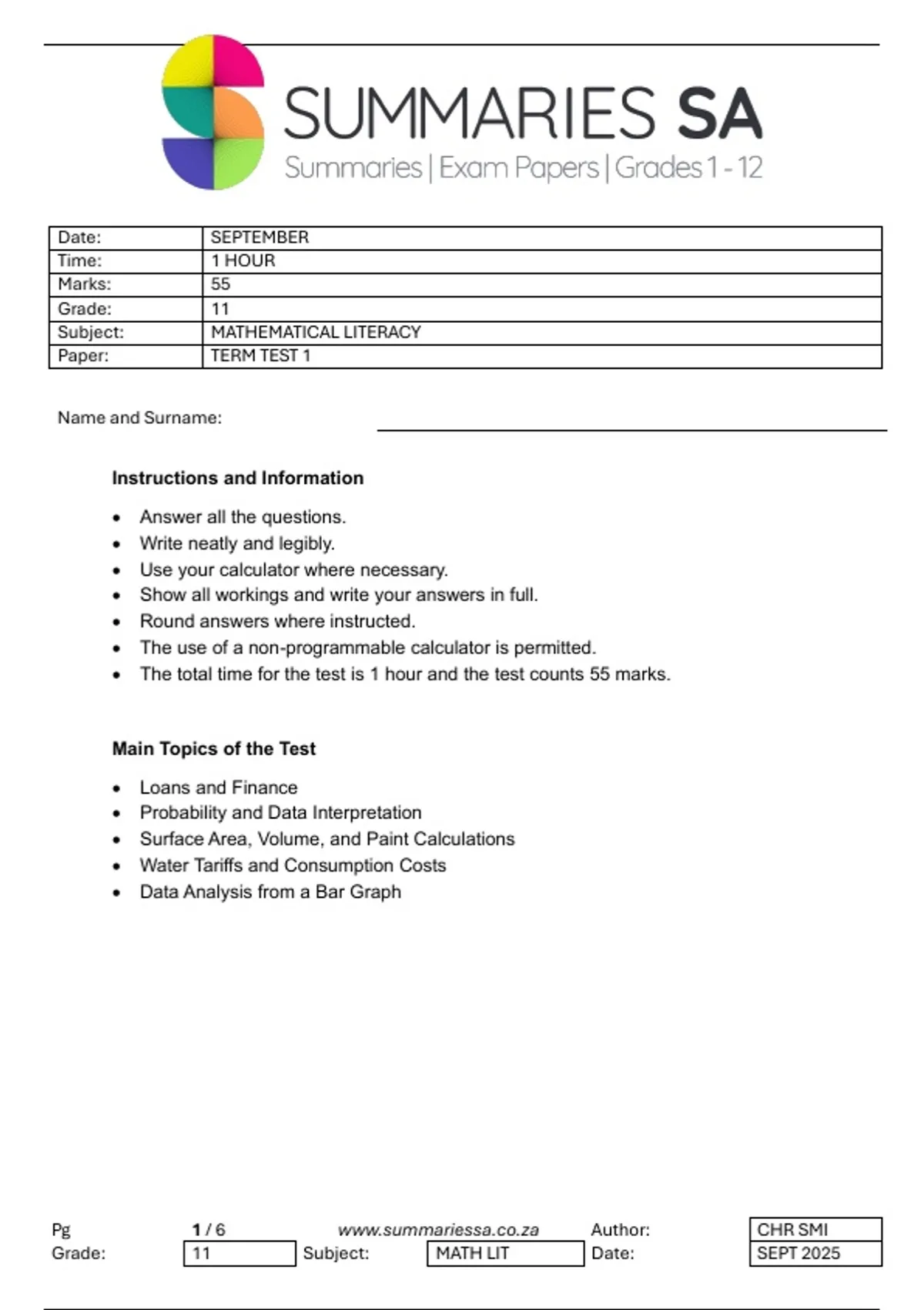 Grade 11 Math Literacy September Paper 1 2025 Total:  55 Marks. Contents of the exam paper contains the following details: Loans and Finance Probability and Data Interpretation Surface Area, Volume, and Paint Calculations Water Tariffs and Consumption Costs Data Analysis from a Bar Graph This is a practice paper with memorandum meant to test the student's knowledge, and will not be the same paper written for the exam. CHR SMI