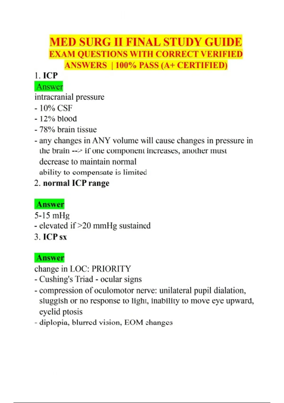 MED SURG II FINAL STUDY GUIDE EXAM QUESTIONS WITH CORRECT VERIFIED ANSWERS | 100% PASS (A+ CERTIFIED) 1. ICP Answer intracranial pressure - 10% CSF - 12% blood - 78% brain tissue - any changes in ANY volume will cause changes in pressure in the brain --> if one component increases, another must decrease to maintain normal - ability to compensate is limited 2. normal ICP range Answer 5-15 mHg - elevated if >20 mmHg sustained 3. ICP sx Answer change in LOC: PRIORITY - Cushing's Triad - ocular signs - compression of oculomotor nerve: unilateral pupil dialation, sluggish or no response to light, inability to move eye upward, eyelid ptosis - diplopia, blurred vision, EOM changes - decrease in motor function: hemiparesis/hemiplegia, decerebrate posturing, decorticate posturing - headache that is continuous and worse in the AM - projectile vomiting with no nausea beforehand 4. CPP equation Answer MAP-ICP - normal is 60-100 - MAP: SBP+2(DBP)/3 5. ngt/ogt related to head injuries Answer avoid gastric dilation - prevent aspiration - start nutritional supplement early 6. ventriculostomy purpose Answer tx interstitial cerebral edema - monitoring ICP, brain perfusion - tube drains the excess fluid --> if indicated, can be intermittent or continuously 7. ventriculostomy management Answer evaluate pt condition - ensure no leaks, kinks, blocks, differences in height, incorrect height, bubbles, and air - carefully monitor the volume drained - prevent infection 8. ICP and hyponatremia Answer hyponatremia can increase ICP with cerebral edema --> osmotically driven movement of water into the brain - manage fluid and electrolyte balance --> IV hypertonic saline - monitor for DI or SIADH 9. improving cerebral perfusion Answer maintain head in midline position, prevent extreme neck flexion - HOB elevated, not >30 degrees - turn slowly - avoid coughing, straining, valsalva --> increases intrathoracic pressure contributes to increased ICP by impending the venous return - avoid hip flexion: decrease the risk of raising the intra-abdomnial pressure, which increase ICP 10. mannitol Answer plasma expander - osmotic diuretic - monitor fluid and electrolyte status - decreases cerebral edema - used to treat h/a associated w increased ICP 11. concussion D/C teaching Answer report: headache that worsens or doesnt go away, nausea, uncontrolled vomiting, increased confusion, change of personality, drowsiness/inability to wake up, slurred speech, weakness, numbness, seizures, loss of consciousness, - ensure rest then gradually return to regular activities - ibuprofen or acetaminophen for headaches 12. subdural hematoma sx Answer sx can show like increased ICP - decreased LOC - headache - ipsilateral pupil dialtion or fixed pupil with severe 13. blood thinners with head injuries Answer ensure assessment of if pt is on anticoags - contusions can have an increased risk of hemorrhage if on anticoags 14. battle's sign Answer sign of head injury (basilar skull fracture) - postauricular ecchymosis (bruising behind the ear) - may mean that there is a significant internal injury to the brain 15. racoon eyes Answer sign of head injury - bruising around the eyes (periorbital ecchymosis) - can be a sign of skull or facial fracture (very classic sign of basilar skull fracture) - can also be a sign of subgaleal hematoma 16. emergent interventions of epidural hematomas & s/sx Answer sx: unconsciousness, brief lucid interval, followed by decrease in LOC, HA, N/V, focal findings
