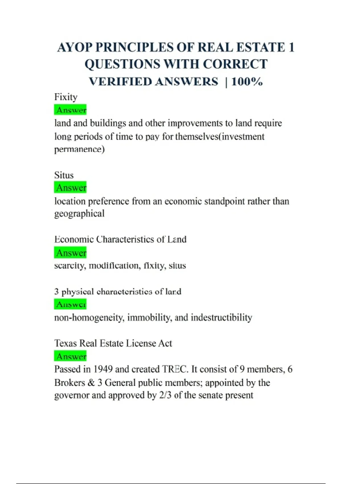 AYOP PRINCIPLES OF REAL ESTATE 1 QUESTIONS WITH CORRECT VERIFIED ANSWERS | 100%Fixity Answer land and buildings and other improvements to land require long periods of time to pay for themselves(investment permanence) Situs Answer location preference from an economic standpoint rather than geographical Economic Characteristics of Land Answer scarcity, modification, fixity, situs 3 physical characteristics of land Answer non-homogeneity, immobility, and indestructibility Texas Real Estate License Act Answer Passed in 1949 and created TREC. It consist of 9 members, 6 Brokers & 3 General public members; appointed by the governor and approved by 2/3 of the senate present 5th Amendment Answer states that a citizen cannot have property taken from them w/o due process of law or just compensation Ordinance Answer a local law Capital Gains Tax Answer a tax levied on the returns that people earn from capital investments, like the profits from the sale of stocks or a home Fair Housing Act Answer The federal law that prohibits discrimination in housing based on race, color, religion, sex, handicap, familial status, and national origin Real Estate Settlement Procedures Act (RESPA) Answer Federal law that ensures that residential buyers and sellers receive full disclosure of all settlement charges National Association of Realtors Answer largest trade group, founded in 1908 Methods of Property Valuation Answer Assessed value, estimated sales value, investment value, replacement value Assessed Value Answer Value established for tax purposes by local municipalities(market value)