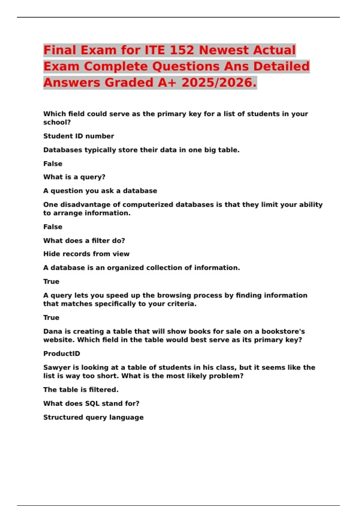 Final Exam for ITE 152 Newest Actual