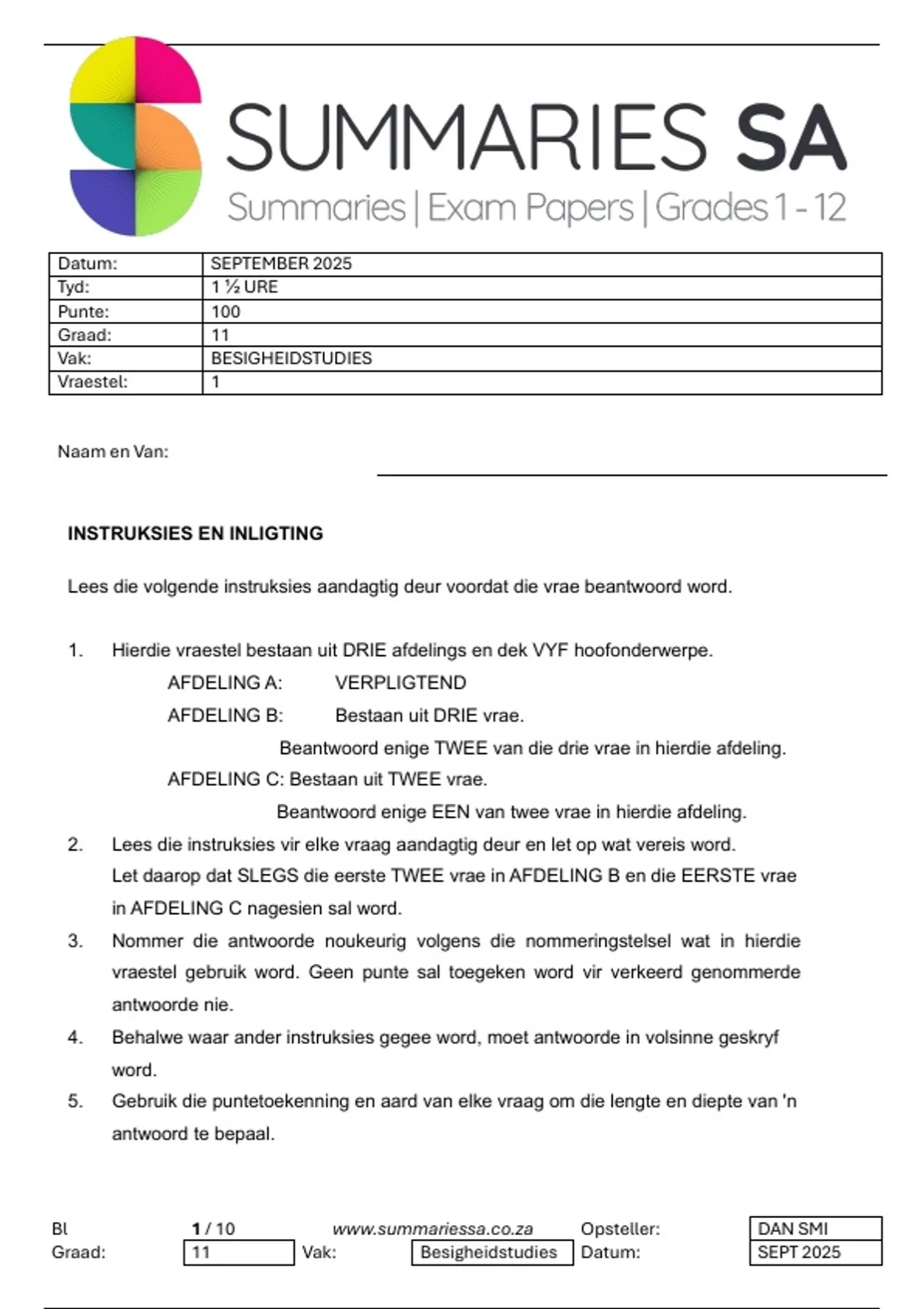 Graad 11 Besigheidstudies (BS) September Vraestel en Memo 2025: Totaal:  100 punte, Tyd:  90 min. Inhoud: Afdeling A: Kortvrae - Verpligte (20 punte). Afdeling B:  DRIE direkte/indirekte tiepe vrae | Keuse:  Beantwoord enige TWEE (40 punte). Afdeling C:  TWEE opsteltiepe vrae | Keuse:  Beantwoord enige EEN (40 punte). Onderwerpe wat in hierdie vraestel gedek word: Entre[reneuriese eienskappe Burgerskap en verantwoordelikhede Verander ’n besigheidsplan in ’n aksieplan Begin ’n onderneming gebasseer op ’n aksieplan Aanbied van besigheidsinligting Hierdie is ‘n oefenvraestel met memorandum bedoel om die leerling se kennis te toets, en sal nie dieselfde vraestel wees wat vir die eksamen geskryf word nie. DAN SMI