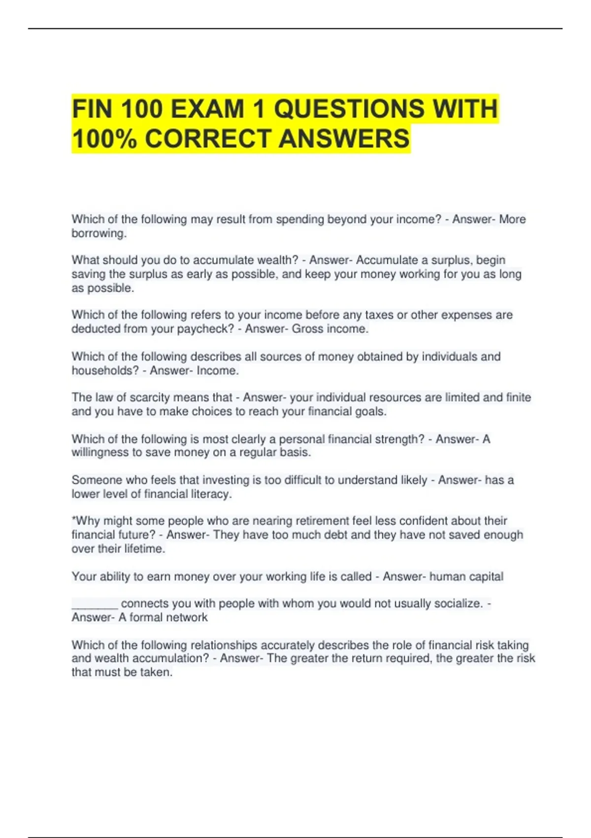 FIN 100 EXAM 1 QUESTIONS WITH 100% CORRECT ANSWERS