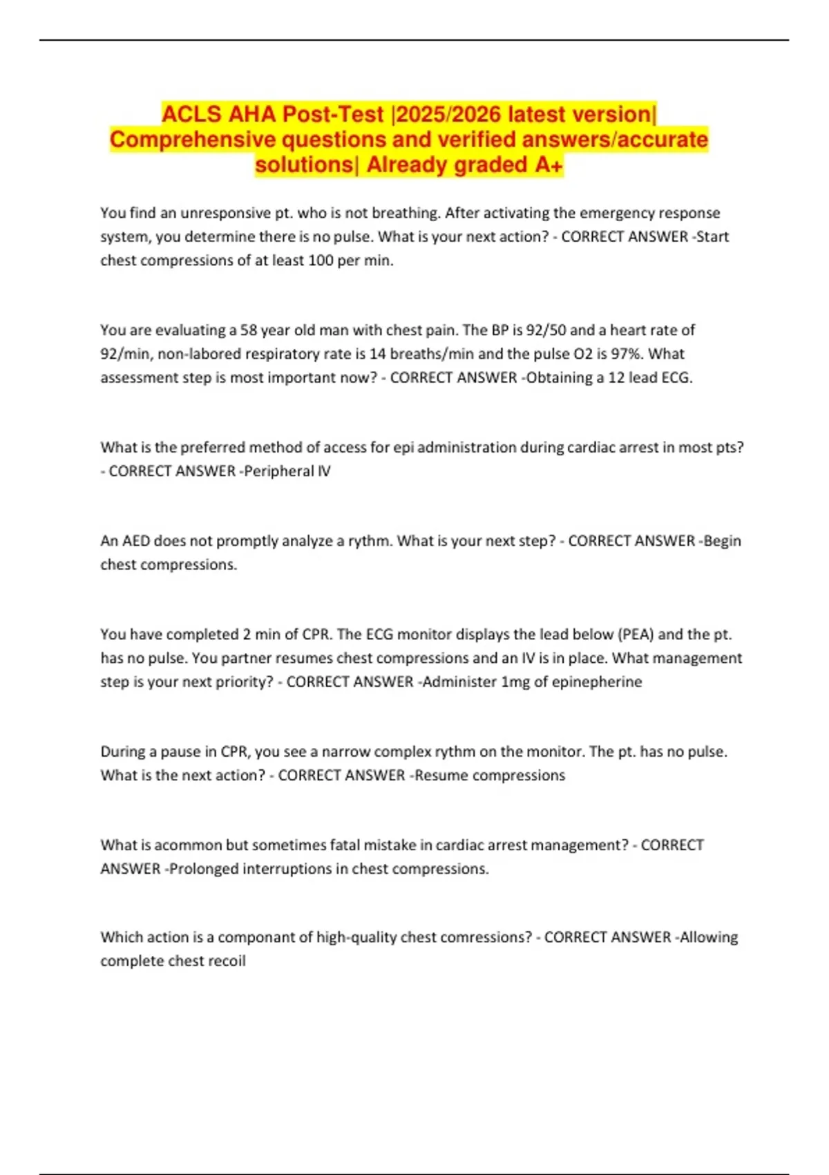ACLS AHA Post-Test |2025/2026 latest version| Comprehensive questions and verified answers/accurate solutions| Already graded A+