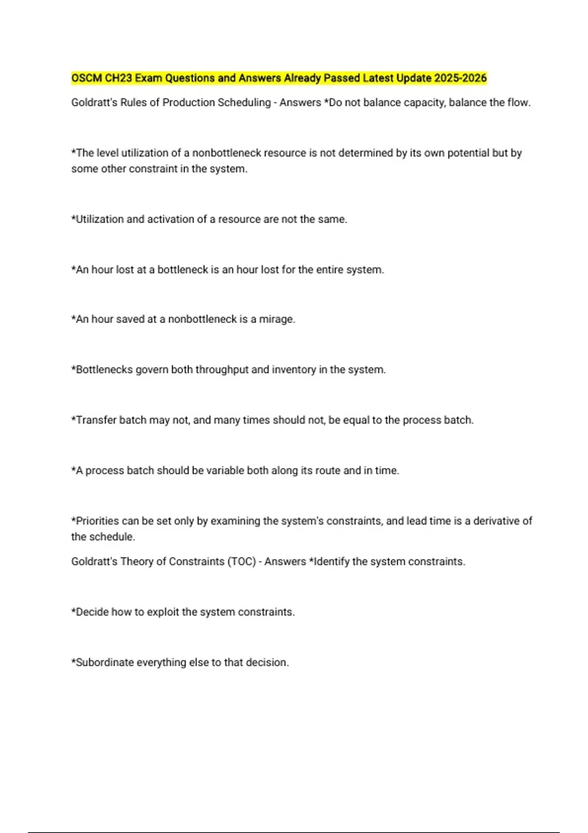 OSCM CH23 Exam Questions and Answers Already Passed Latest Update Goldratt's Rules of Production Scheduling - Answers *Do not balance capacity, balance the flow. *The level utilization of a nonbottleneck resource is not determined by its own potential but by some other constraint in the system. *Utilization and activation of a resource are not the same. *An hour lost at a bottleneck is an hour lost for the entire system. *An hour saved at a nonbottleneck is a mirage. *Bottlenecks govern both throughput and inventory in the system. *Transfer batch may not, and many times should not, be equal to the process batch. *A process batch should be variable both along its route and in time. *Priorities can be set only by examining the system's constraints, and lead time is a derivative of the schedule. Goldratt's Theory of Constraints (TOC) - Answers *Identify the system constraints. *Decide how to exploit the system constraints. *Subordinate everything else to that decision. *Elevate the system constraints. *If, in the previous steps, the constraints have been broken, go back to step 1, but do not let inertia become the system constraint.