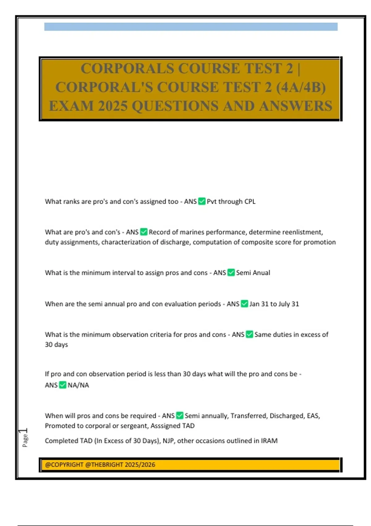 What ranks are pro's and con's assigned too - ANS Pvt through CPL What are pro's and con's - ANS Record of marines performance, determine reenlistment, duty assignments, characterization of discharge, computation of composite score for promotion What is the minimum interval to assign pros and cons - ANS Semi Anual When are the semi annual pro and con evaluation periods - ANS Jan 31 to July 31 What is the minimum observation criteria for pros and cons - ANS Same duties in excess of 30 days If pro and con observation period is less than 30 days what will the pro and cons be - ANS NA/NA When will pros and cons be required - ANS Semi annually, Transferred, Discharged, EAS, Promoted to corporal or sergeant, Asssigned TAD Completed TAD (In Excess of 30 Days), NJP, other occasions outlined in IRAM CORPORALS COURSE TEST 2 | CORPORAL'S COURSE TEST 2 (4A/4B) EXAM 2025 QUESTIONS AND ANSWERS @COPYRIGHT @THEBRIGHT 2025/2026 Page2 What are the minimum pros and cons for reenlistment - ANS 4.0/4.0 What are the minimum pros and cons for corporals applying for recruiting duty - ANS 4.6/4.6 avg in service What are the minimum pros and cons for MSG - ANS 4.2/4.2 avg in service What are the minimum pros and cons for independent duty - ANS 4.4/4.4 avg in service What are the minimum pros and cons for honorable discharge - ANS 3.0/4.0 Who recommends pros and cons - ANS Marines NCO or SNCO recommends Who assigns pros and cons - ANS Commander assigns pros and cons What is in the IRAM - ANS Occasions for pros and cons Attributes examined The rating scales What are the attributes of conduct - ANS Obediance, Attitude, Participation, influence, reliability, physical fitness, courtesy, bearing, interest, cooperation, adaptability What should proficiency marks take into account - ANS Whole marine concept, Technical duty skllls and specialized kn