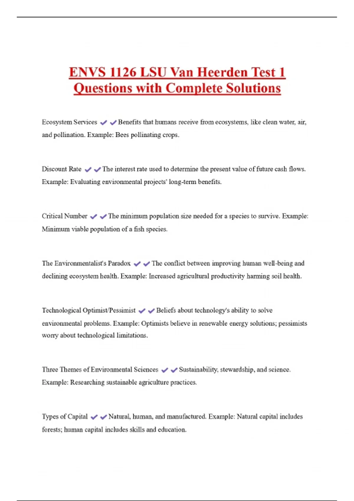 ENVS 1126 LSU Van Heerden Test 1 Questions with Complete Solutions Ecosystem Services Benefits that humans receive from ecosystems, like clean water, air, and pollination. Example: Bees pollinating crops. Discount Rate The interest rate used to determine the present value of future cash flows. Example: Evaluating environmental projects' long-term benefits. Critical Number The minimum population size needed for a species to survive. Example: Minimum viable population of a fish species. The Environmentalist's Paradox The conflict between improving human well-being and declining ecosystem health. Example: Increased agricultural productivity harming soil health.
