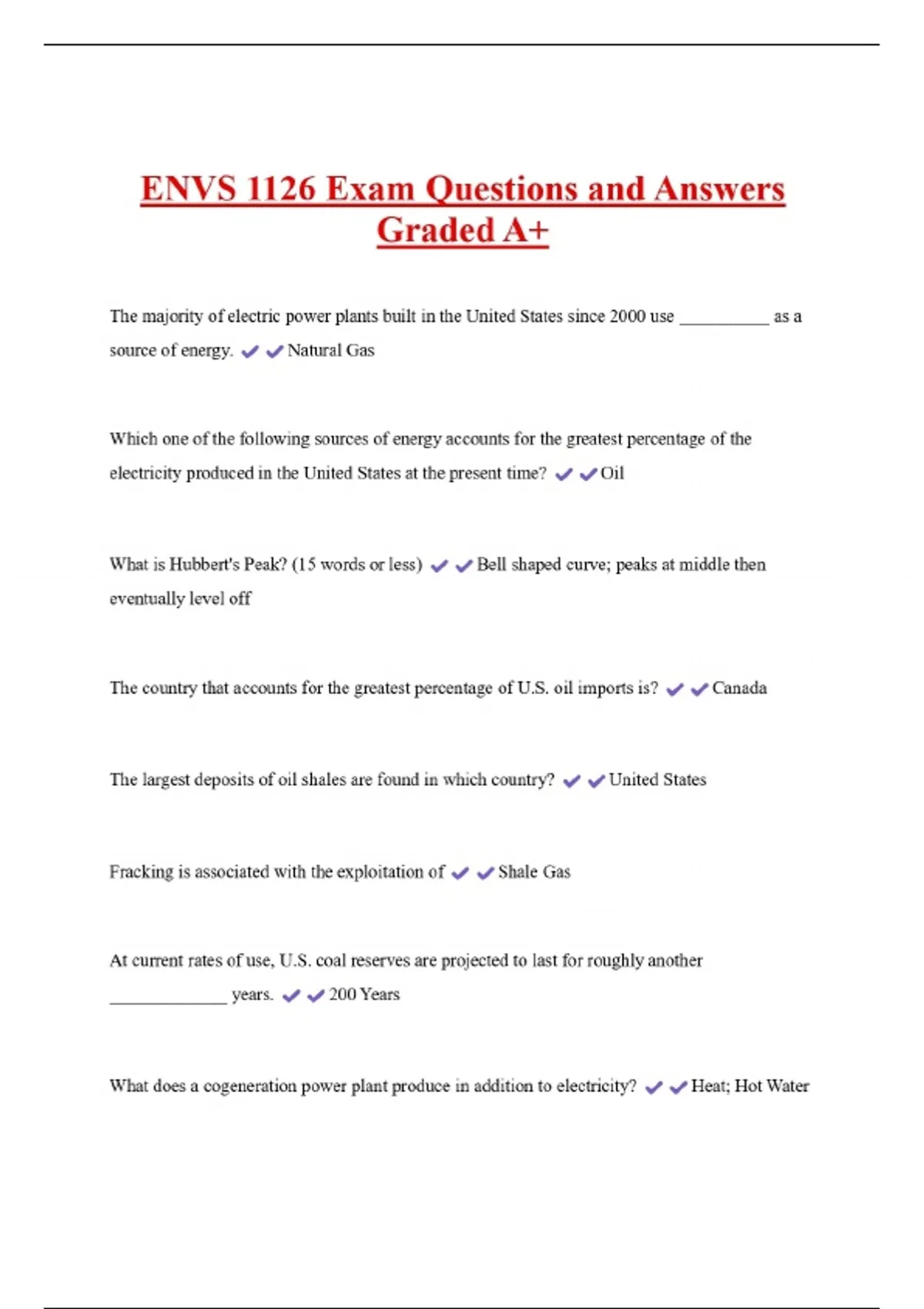 ENVS 1126 Exam Questions and Answers Graded A+ The majority of electric power plants built in the United States since 2000 use __________ as a source of energy. Natural Gas Which one of the following sources of energy accounts for the greatest percentage of the electricity produced in the United States at the present time? What is Hubbert's Peak? (15 words or less) Oil Bell shaped curve; peaks at middle then eventually level off The country that accounts for the greatest percentage of U.S. oil imports is? The largest deposits of oil shales are found in which country? Fracking is associated with the exploitation of Shale Gas United States