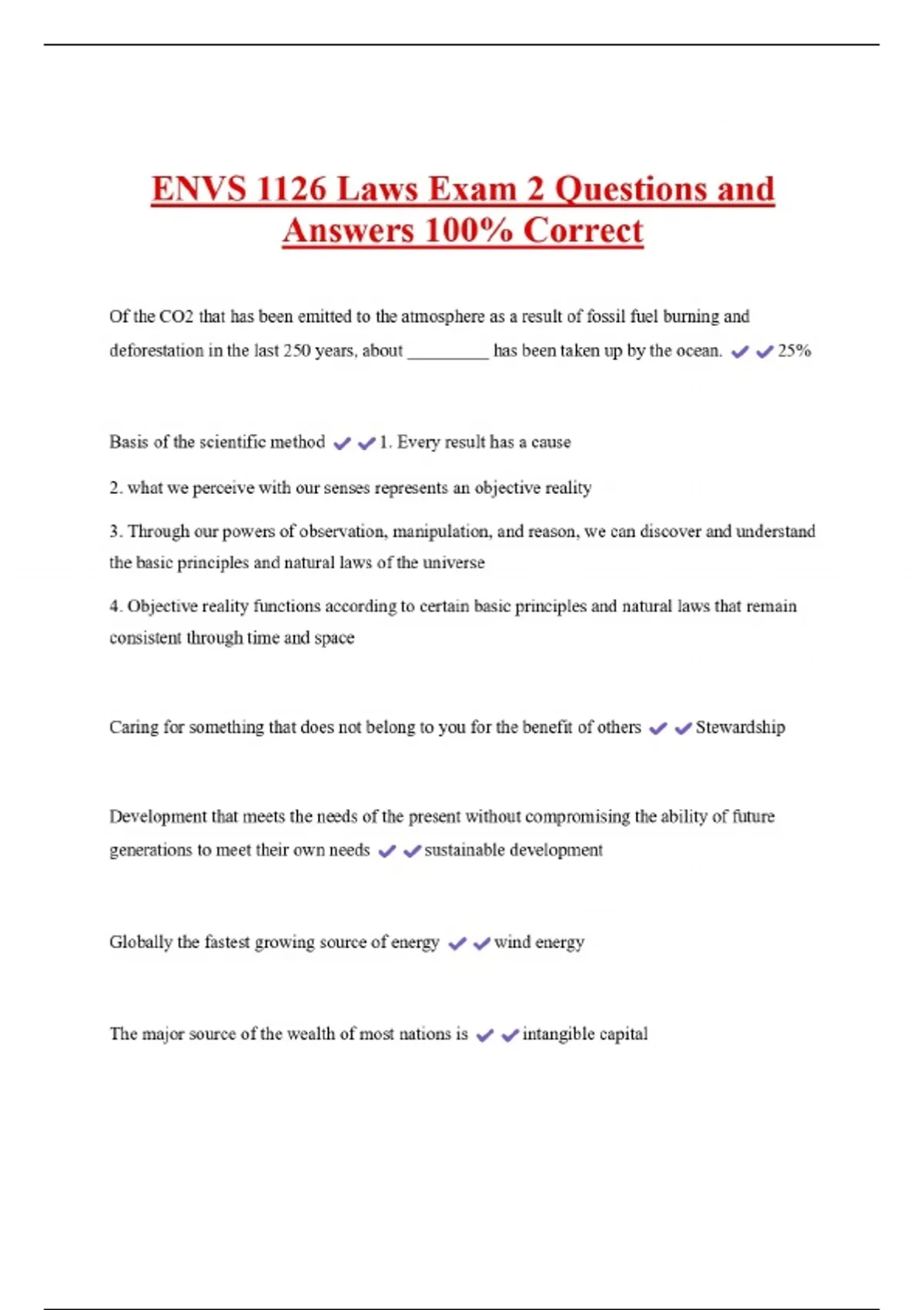 ENVS 1126 Laws Exam 2 Questions and Answers 100% Correct Of the CO2 that has been emitted to the atmosphere as a result of fossil fuel burning and deforestation in the last 250 years, about _________ has been taken up by the ocean. Basis of the scientific method 1. Every result has a cause 2. what we perceive with our senses represents an objective reality 25% 3. Through our powers of observation, manipulation, and reason, we can discover and understand the basic principles and natural laws of the universe 4. Objective reality functions according to certain basic principles and natural laws that remain consistent through time and space Caring for something that does not belong to you for the benefit of others Stewardship Development that meets the needs of the present without compromising the ability of future generations to meet their own needs sustainable development