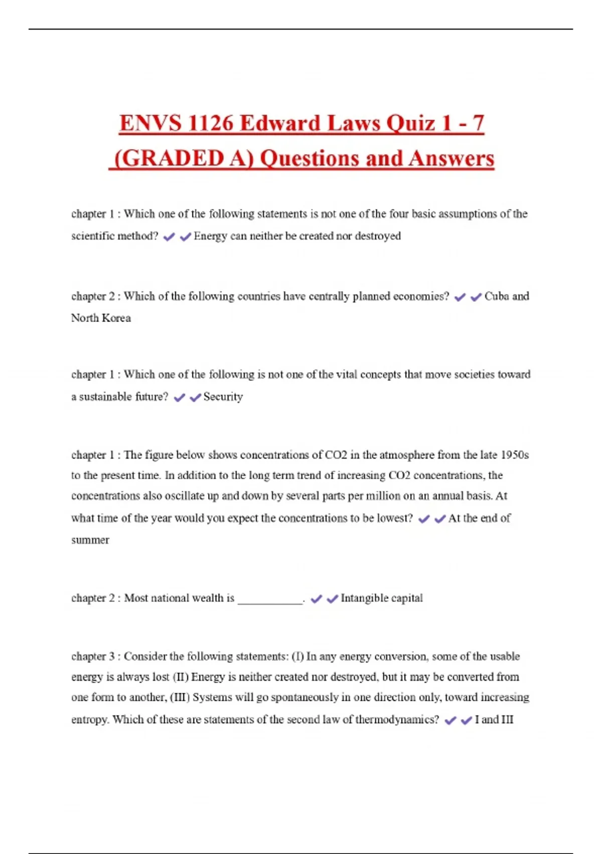 ENVS 1126 Edward Laws Quiz 1 - 7 (GRADED A) Questions and Answers chapter 1 : Which one of the following statements is not one of the four basic assumptions of the scientific method? Energy can neither be created nor destroyed chapter 2 : Which of the following countries have centrally planned economies? North Korea Cuba and chapter 1 : Which one of the following is not one of the vital concepts that move societies toward a sustainable future? Security