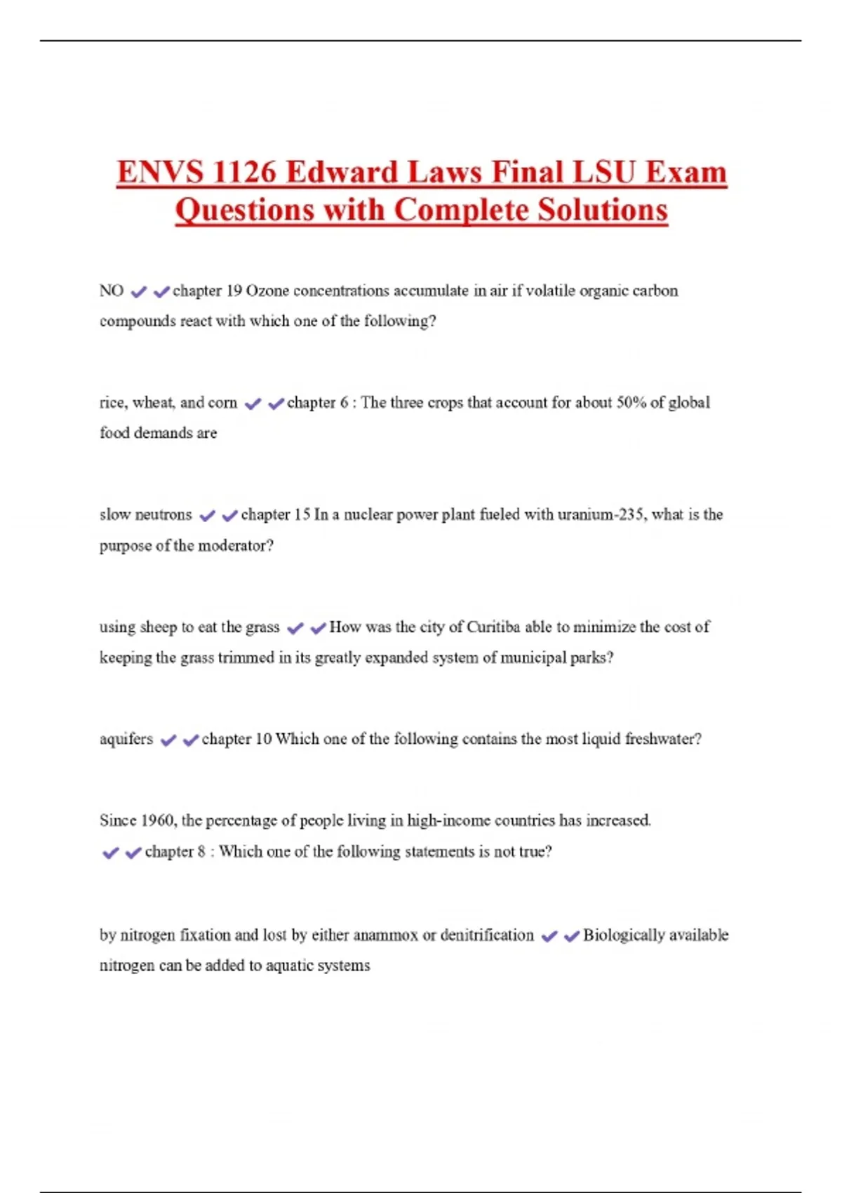 ENVS 1126 Edward Laws Final LSU Exam Questions with Complete Solutions NO chapter 19 Ozone concentrations accumulate in air if volatile organic carbon compounds react with which one of the following? rice, wheat, and corn food demands are slow neutrons purpose of the moderator? using sheep to eat the grass chapter 6 : The three crops that account for about 50% of global chapter 15 In a nuclear power plant fueled with uranium-235, what is the How was the city of Curitiba able to minimize the cost of keeping the grass trimmed in its greatly expanded system of municipal parks?