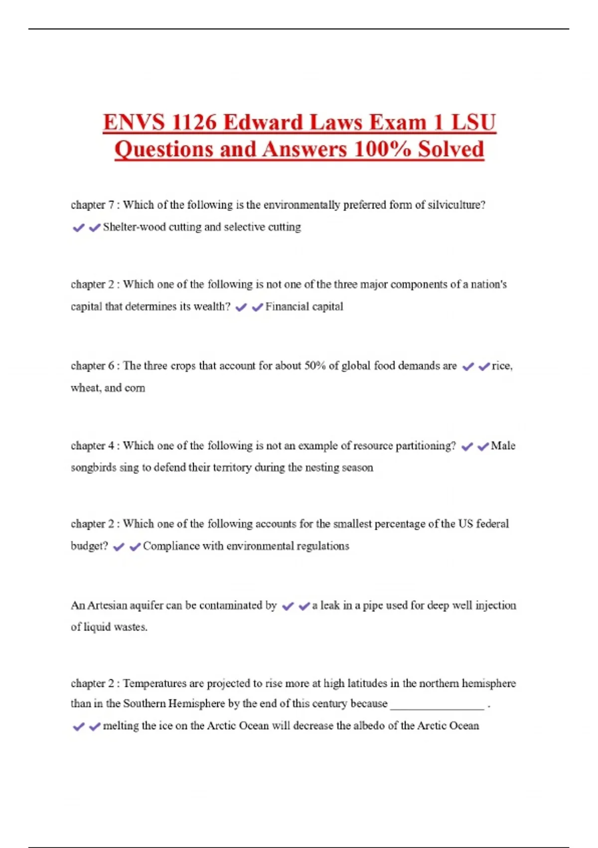 ENVS 1126 Edward Laws Exam 1 LSU Questions and Answers 100% Solved chapter 7 : Which of the following is the environmentally preferred form of silviculture? Shelter-wood cutting and selective cutting chapter 2 : Which one of the following is not one of the three major components of a nation's capital that determines its wealth? Financial capital chapter 6 : The three crops that account for about 50% of global food demands are wheat, and corn chapter 4 : Which one of the following is not an example of resource partitioning? songbirds sing to defend their territory during the nesting season rice, Male chapter 2 : Which one of the following accounts for the smallest percentage of the US federal budget? Compliance with environmental regulations
