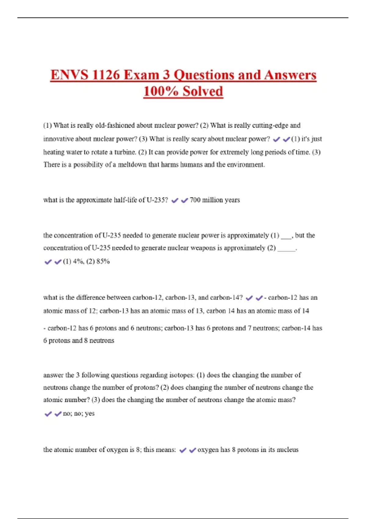 ENVS 1126 Exam 3 Questions and Answers 100% Solved (1) What is really old-fashioned about nuclear power? (2) What is really cutting-edge and innovative about nuclear power? (3) What is really scary about nuclear power? (1) it's just heating water to rotate a turbine. (2) It can provide power for extremely long periods of time. (3) There is a possibility of a meltdown that harms humans and the environment. what is the approximate half-life of U-235? 700 million years the concentration of U-235 needed to generate nuclear power is approximately (1) ___, but the concentration of U-235 needed to generate nuclear weapons is approximately (2) _____. (1) 4%, (2) 85% what is the difference between carbon-12, carbon-13, and carbon-14? - carbon-12 has an atomic mass of 12; carbon-13 has an atomic mass of 13, carbon 14 has an atomic mass of 14 - carbon-12 has 6 protons and 6 neutrons; carbon-13 has 6 protons and 7 neutrons; carbon-14 has 6 protons and 8 neutrons