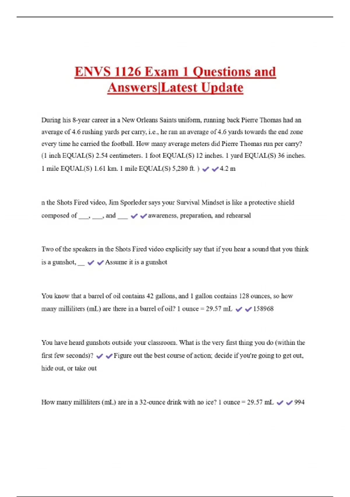 ENVS 1126 Exam 1 Questions and Answers|Latest Update During his 8-year career in a New Orleans Saints uniform, running back Pierre Thomas had an average of 4.6 rushing yards per carry, i.e., he ran an average of 4.6 yards towards the end zone every time he carried the football. How many average meters did Pierre Thomas run per carry? (1 inch EQUAL(S) 2.54 centimeters. 1 foot EQUAL(S) 12 inches. 1 yard EQUAL(S) 36 inches. 1 mile EQUAL(S) 1.61 km. 1 mile EQUAL(S) 5,280 ft. ) 4.2 m n the Shots Fired video, Jim Sporleder says your Survival Mindset is like a protective shield composed of ___, ___, and ___ awareness, preparation, and rehearsal Two of the speakers in the Shots Fired video explicitly say that if you hear a sound that you think is a gunshot, __ Assume it is a gunshot