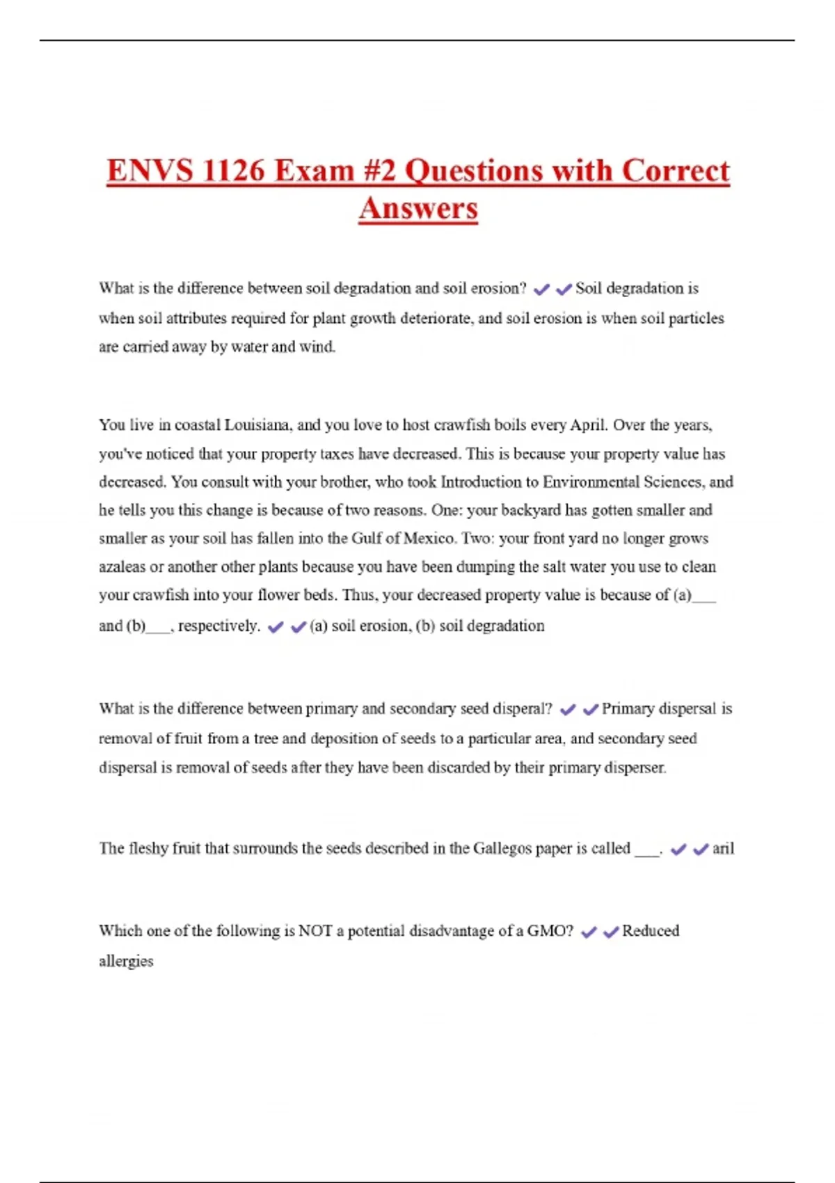 ENVS 1126 Exam #2 Questions with Correct Answers What is the difference between soil degradation and soil erosion? Soil degradation is when soil attributes required for plant growth deteriorate, and soil erosion is when soil particles are carried away by water and wind. You live in coastal Louisiana, and you love to host crawfish boils every April. Over the years, you've noticed that your property taxes have decreased. This is because your property value has decreased. You consult with your brother, who took Introduction to Environmental Sciences, and he tells you this change is because of two reasons. One: your backyard has gotten smaller and smaller as your soil has fallen into the Gulf of Mexico. Two: your front yard no longer grows azaleas or another other plants because you have been dumping the salt water you use to clean your crawfish into your flower beds. Thus, your decreased property value is because of (a)___ and (b)___, respectively. (a) soil erosion, (b) soil degradation