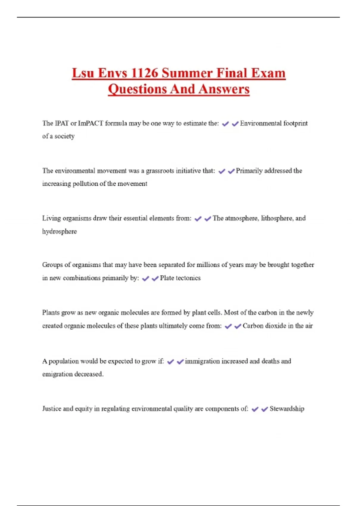 Lsu Envs 1126 Summer Final Exam Questions And Answers