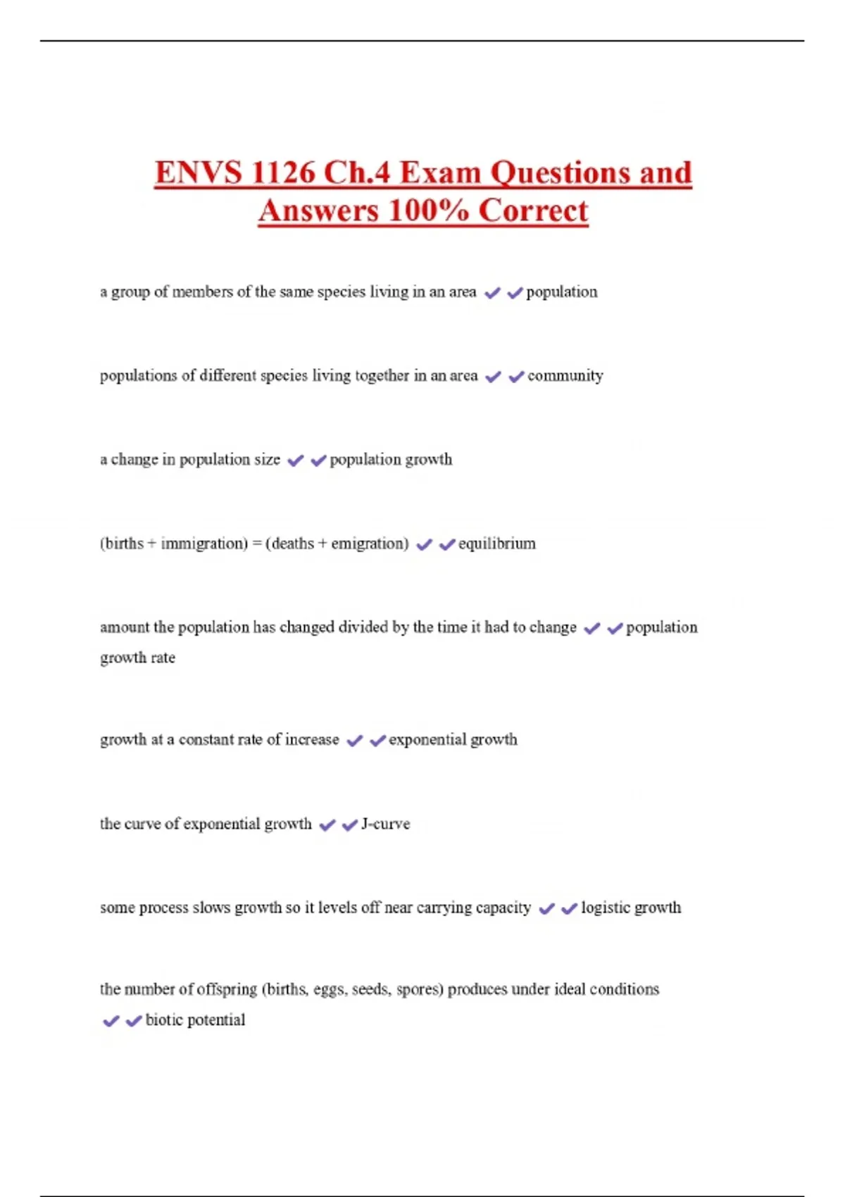 ENVS 1126 Ch.4 Exam Questions and Answers 100% Correct a group of members of the same species living in an area populations of different species living together in an area a change in population size population growth (births + immigration) = (deaths + emigration) population community equilibrium amount the population has changed divided by the time it had to change growth rate