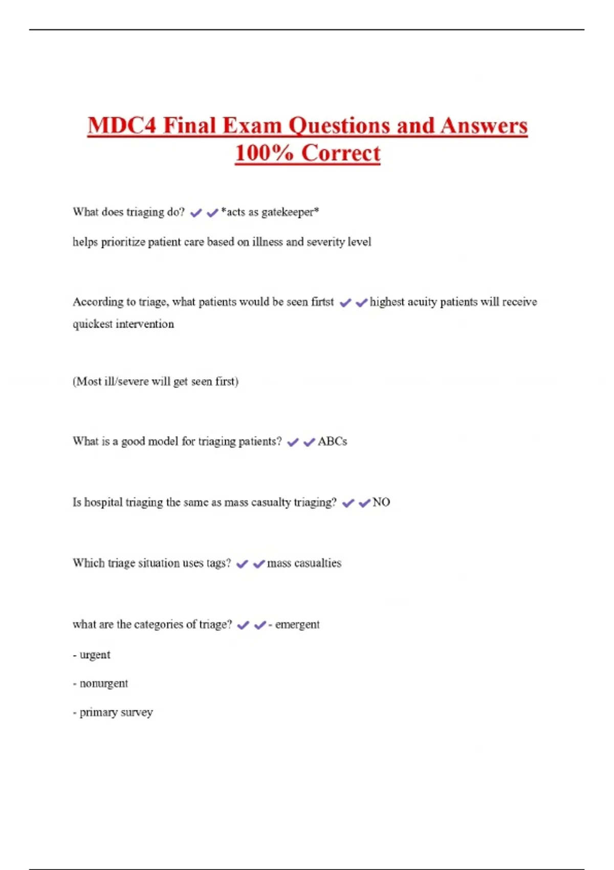 MDC4 Final Exam Questions and Answers 100% Correct What does triaging do? *acts as gatekeeper* helps prioritize patient care based on illness and severity level According to triage, what patients would be seen firtst quickest intervention (Most ill/severe will get seen first) What is a good model for triaging patients? ABCs Is hospital triaging the same as mass casualty triaging? Which triage situation uses tags? what are the categories of triage? - urgent - nonurgent - primary survey mass casualties - emergent highest acuity patients will receive NO