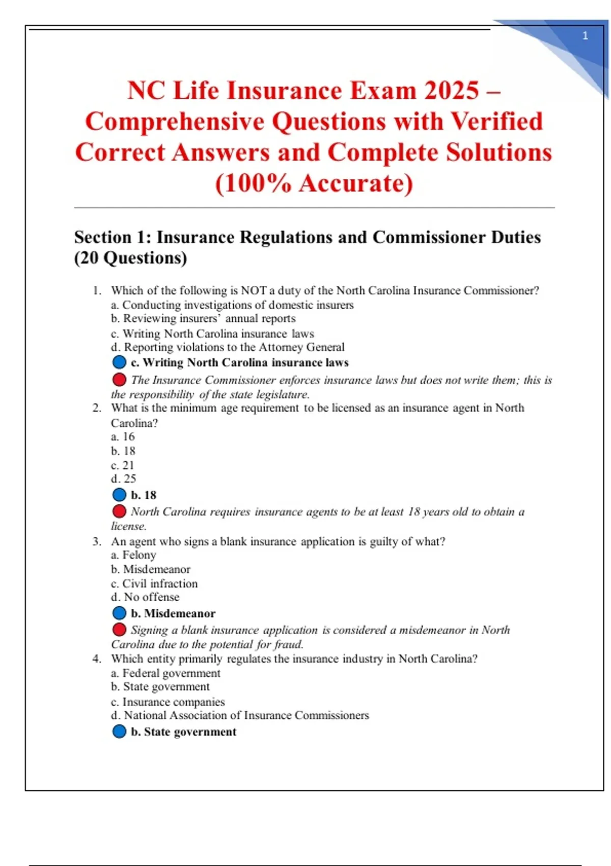 This document provides a complete collection of comprehensive questions and verified correct answers for the North Carolina Life Insurance Exam, updated for 2025. Each question is accompanied by complete solutions to ensure clear understanding of the material. Designed for accuracy and reliability, this resource helps candidates prepare thoroughly and build confidence for the NC Life Insurance licensing exam.