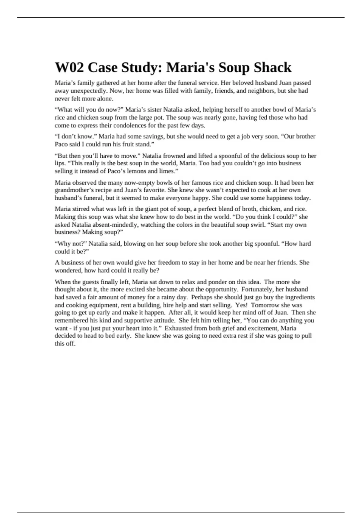 Brigham Young University, Idaho FIN 300 FIN 300 (FIN300) : W02 Case Study: Maria's Soup Shack | Answered Complete updated 100% Fall 2025/26. W02 Case Study: Maria's Soup Shack Maria’s family gathered at her home after the funeral service. Her beloved husband Juan passed away unexpectedly. Now, her home was filled with family, friends, and neighbors, but she had never felt more alone.   “What will you do now?” Maria’s sister Natalia asked, helping herself to another bowl of Maria’s rice and chicken soup from the large pot. The soup was nearly gone, having fed those who had come to express their condolences for the past few days.  “I don’t know.” Maria had some savings, but she would need to get a job very soon. “Our brother Paco said I could run his fruit stand.”  “But then you’ll have to move.” Natalia frowned and lifted a spoonful of the delicious soup to her lips. “This really is the best soup in the world, Maria. Too bad you couldn’t go into business selling it instead of Paco’s lemons and limes.”  Maria observed the many now-empty bowls of her famous rice and chicken soup. It had been her grandmother’s recipe and Juan’s favorite. She knew she wasn’t expected to cook at her own husband’s funeral, but it seemed to make everyone happy. She could use some happiness today.  Maria stirred what was left in the giant pot of soup, a perfect blend of broth, chicken, and rice. Making this soup was what she knew how to do best in the world. “Do you think I could?” she asked Natalia absent-mindedly, watching the colors in the beautiful soup swirl. “Start my own business? Making soup?”   “Why not?” Natalia said, blowing on her soup before she took another big spoonful. “How hard could it be?”  A business of her own would give her freedom to stay in her home and be near her friends. She wondered, how hard could it really be?  When the guests finally left, Maria sat down to relax and ponder on this idea.  The more she thought about it, the more excited she became about the opportunity.  Fortunately, her husband had saved a fair amount of money for a rainy day.  Perhaps she should just go buy the ingredients and cooking equipment, rent a building, hire help and start selling.  Yes!  Tomorrow she was going to get up early and make it happen.  After all, it would keep her mind off of Juan.  Then she remembered his kind and supportive attitude.  She felt him telling her, “You can do anything you want - if you just put your heart into it.”  Exhausted from both grief and excitement, Maria decided to head to bed early.  She knew she was going to need extra rest if she was going to pull this off.