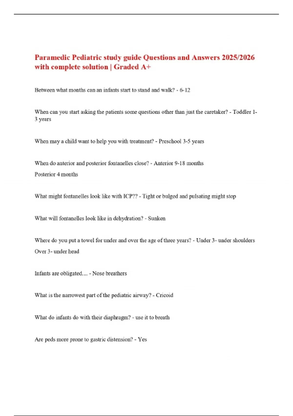 Paramedic Pediatric study guide Questions and Answers 2025/2026 with complete solution | Graded A+