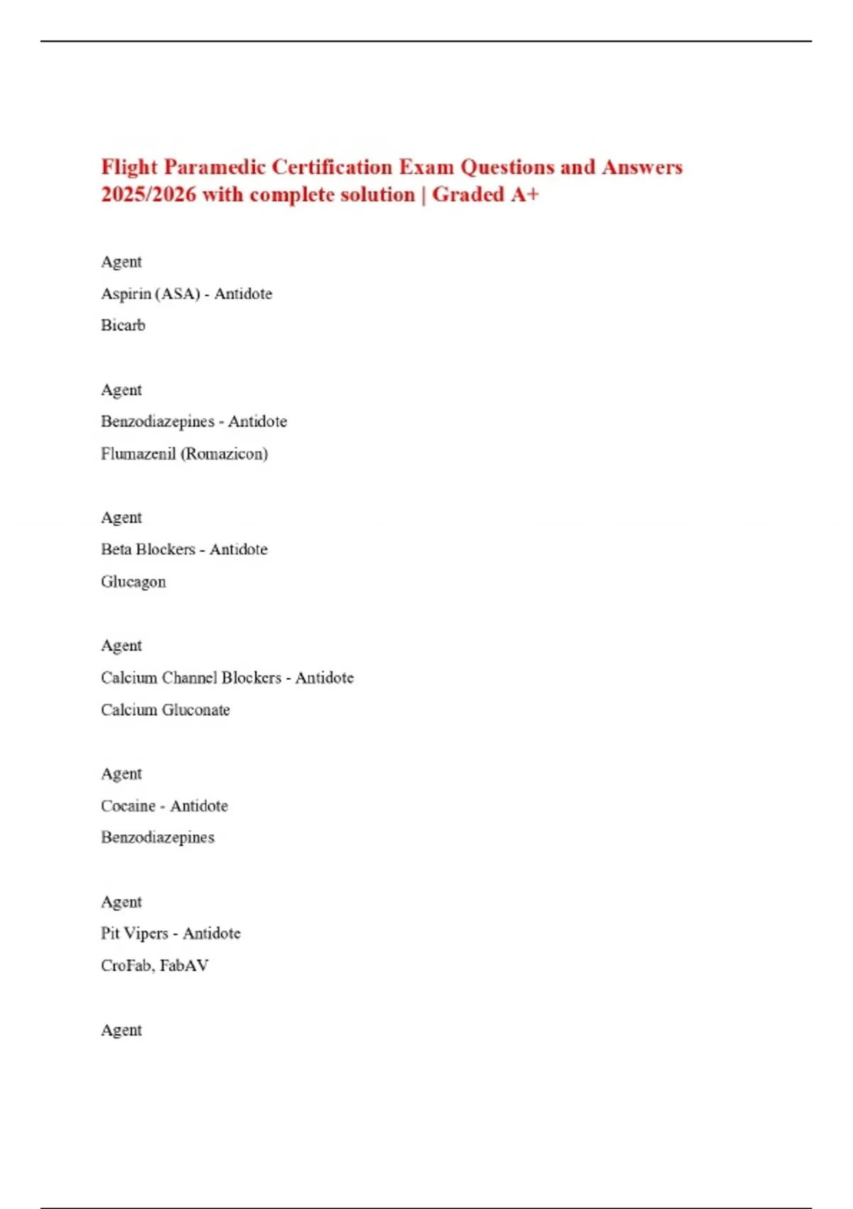 Flight Paramedic Certification Exam Questions and Answers 2025/2026 with complete solution | Graded A+