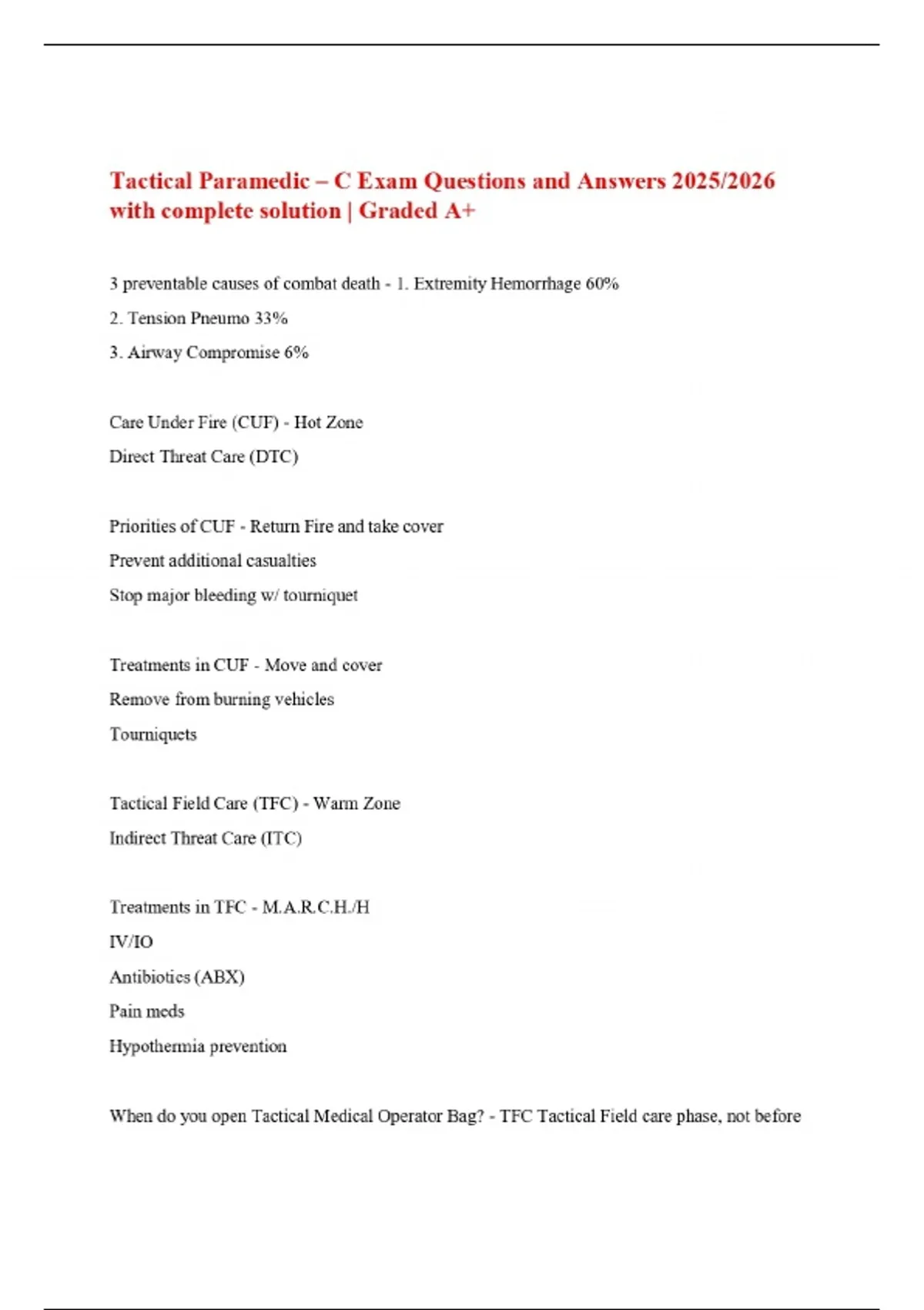 Tactical Paramedic – C Exam Questions and Answers 2025/2026 with complete solution | Graded A+