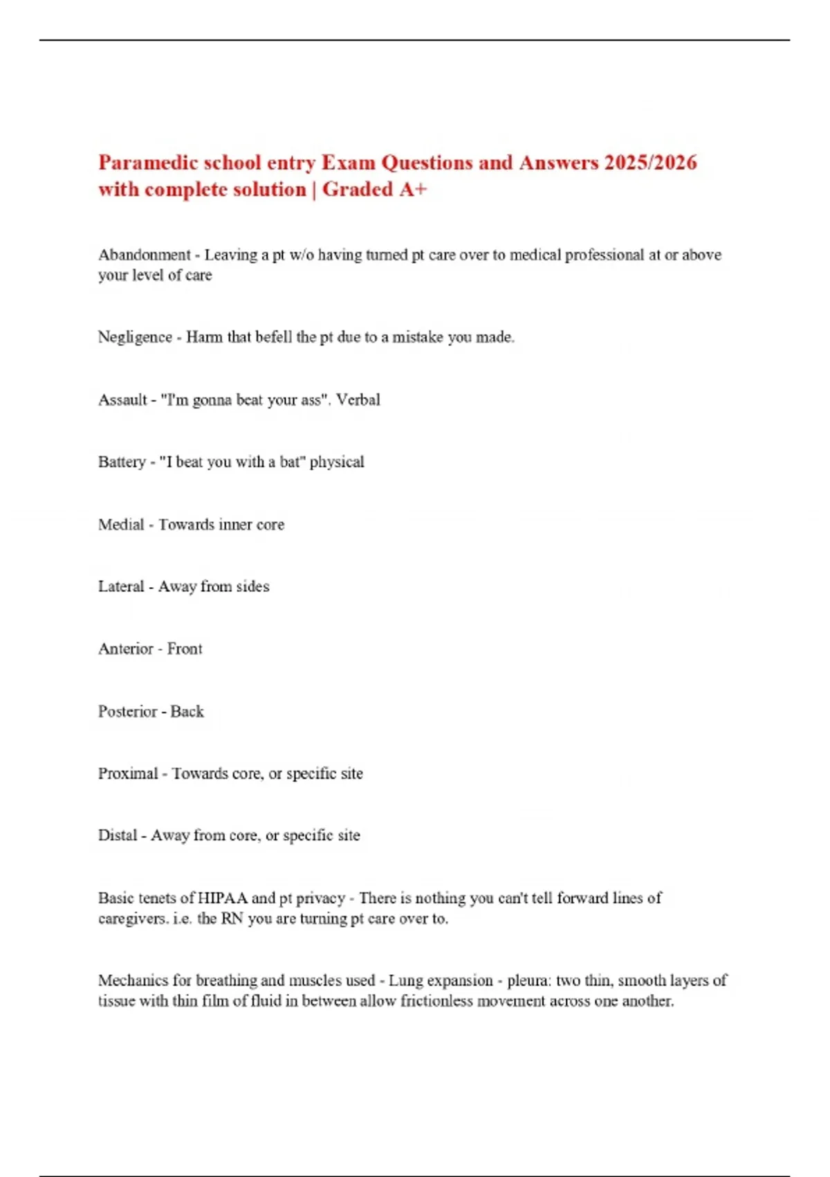 Paramedic school entry Exam Questions and Answers 2025/2026 with complete solution | Graded A+