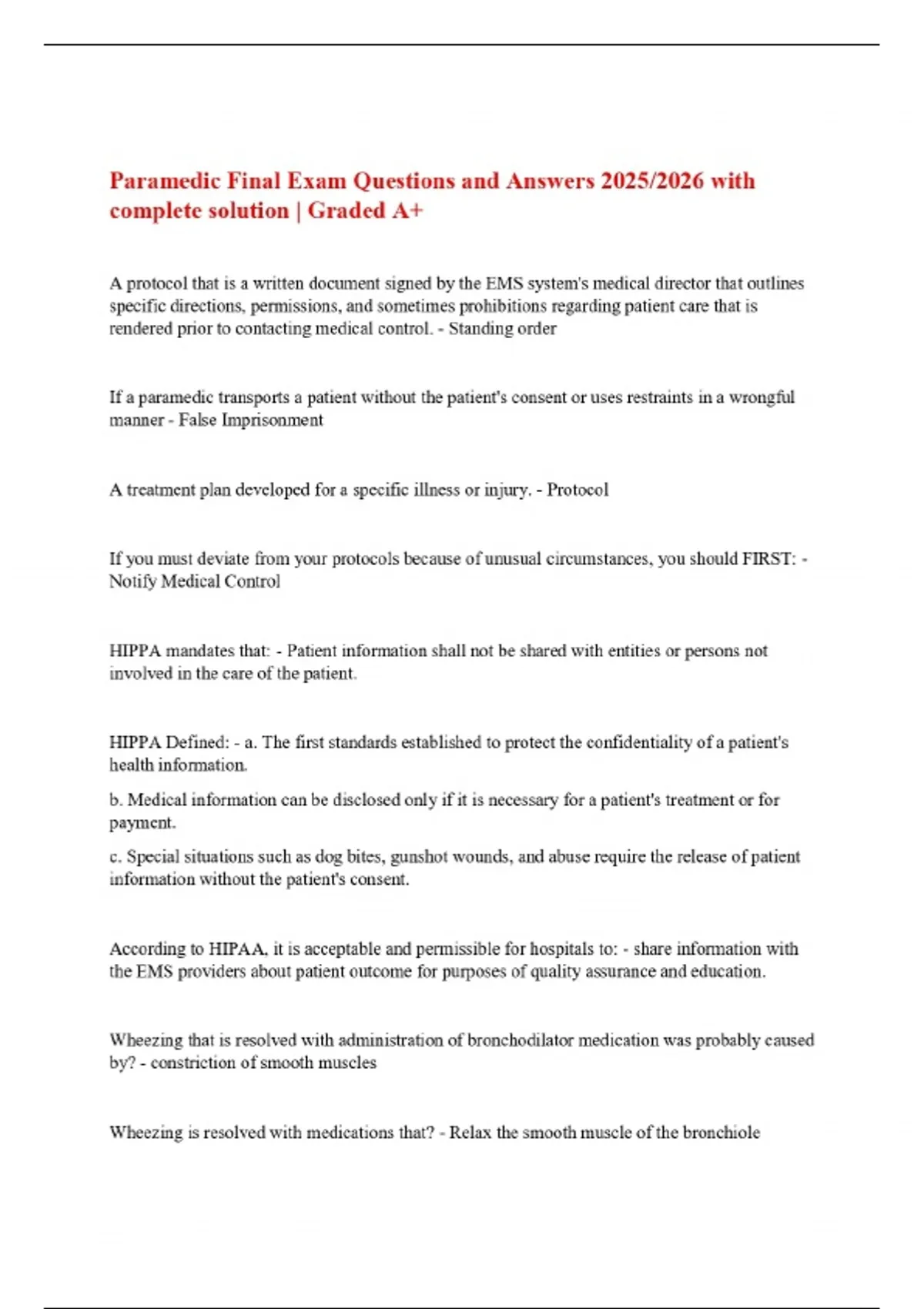 Paramedic Final Exam Questions and Answers 2025/2026 with complete solution | Graded A+