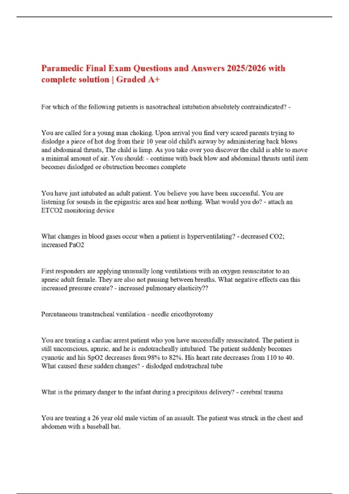 Paramedic Final Exam Questions and Answers 2025/2026 with complete solution | Graded A+