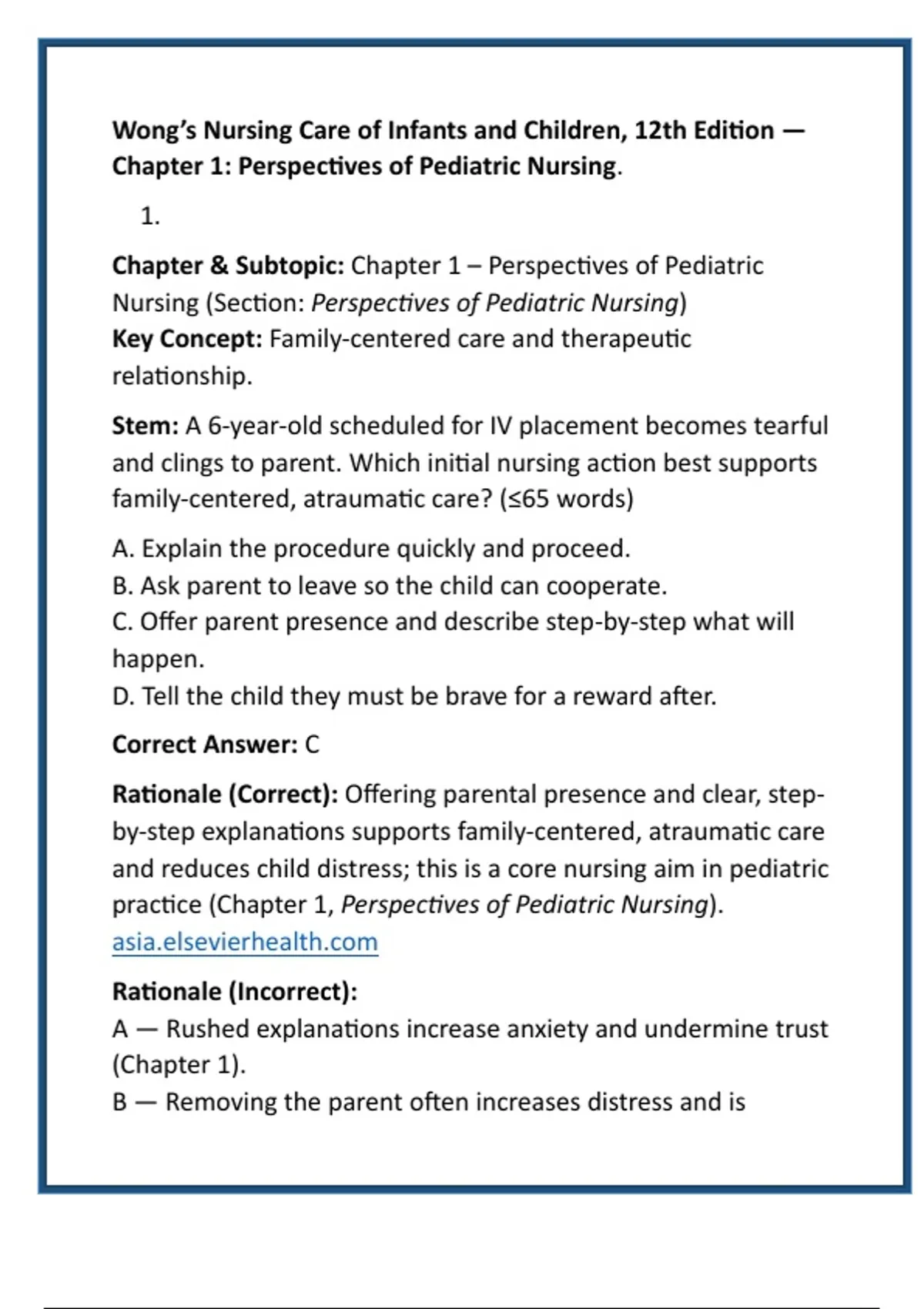 Rationale (Correct): Offering parental presence and clear, step-
