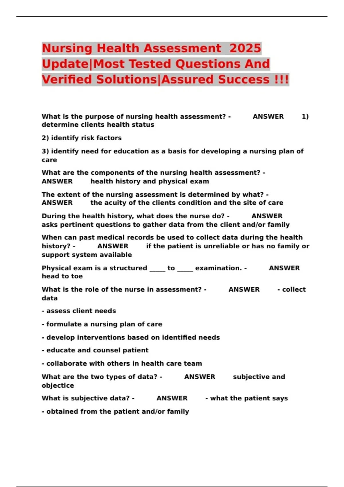Nursing Health Assessment 2025 Update|Most Tested Questions And Verified Solutions|Assured Success !!!