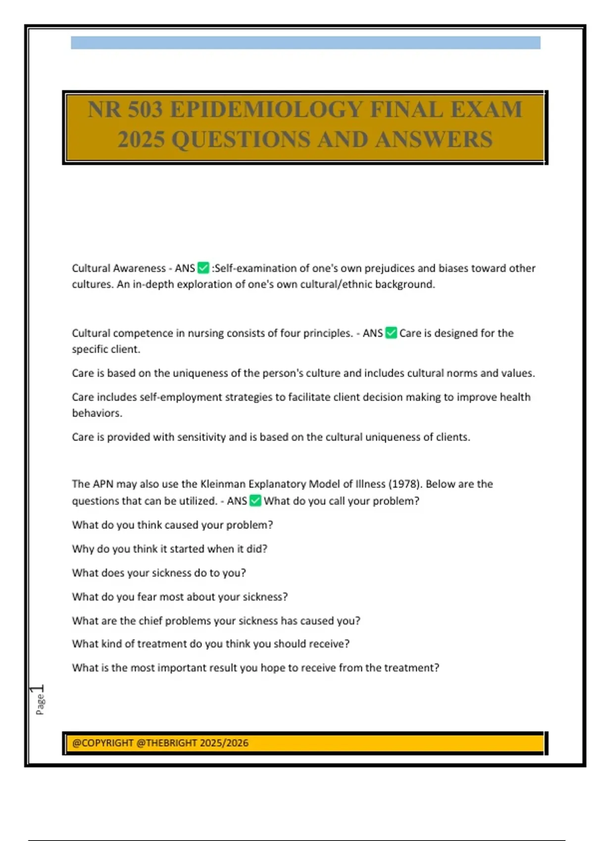 Cultural Awareness - ANS :Self-examination of one's own prejudices and biases toward other cultures. An in-depth exploration of one's own cultural/ethnic background. Cultural competence in nursing consists of four principles. - ANS Care is designed for the specific client. Care is based on the uniqueness of the person's culture and includes cultural norms and values. Care includes self-employment strategies to facilitate client decision making to improve health behaviors. Care is provided with sensitivity and is based on the cultural uniqueness of clients. The APN may also use the Kleinman Explanatory Model of Illness (1978). Below are the questions that can be utilized. - ANS What do you call your problem? What do you think caused your problem? Why do you think it started when it did? What does your sickness do to you? What do you fear most about your sickness? What are the chief problems your sickness has caused you? What kind of treatment do you think you should receive? What is the most important result you hope to receive from the treatment? NR 503 EPIDEMIOLOGY FINAL EXAM 2025 QUESTIONS AND ANSWERS @COPYRIGHT @THEBRIGHT 2025/2026 Page2 According to Giger and Davidhizer (2000), although cultures differ, they all have the same basic organizing factors that must be assessed in order to provide care for culturally diverse patients. These factors include - ANS communication (verbal and nonverbal); personal space; social organization; time perception; environmental control; and biological variations. The NCCC uses four major approaches to fulfill its mission, including - ANS Web-based technical assistance, (2) knowledge development and dissemination, (3) supporting a community of learners, and (4) collaboration and partnerships with diverse groups. Epidemiological Triad: - ANS host, agent, environment Genetics - ANS The study of individual genes and their impact on relatively rare single gene disorders Absolute risk - ANS is the probability of an event, such as illness, injury, or death. Gives no indication of how its magnitude compares with others The odds ratio - ANS closely approximates the relative risk if the disease is rare. Odds ratio and the relative risk are used - ANS to assess the strength of association between risk factor and outcome. How is Attributible risk used - ANS is used to make risk-based decisions for individuals. Population-att