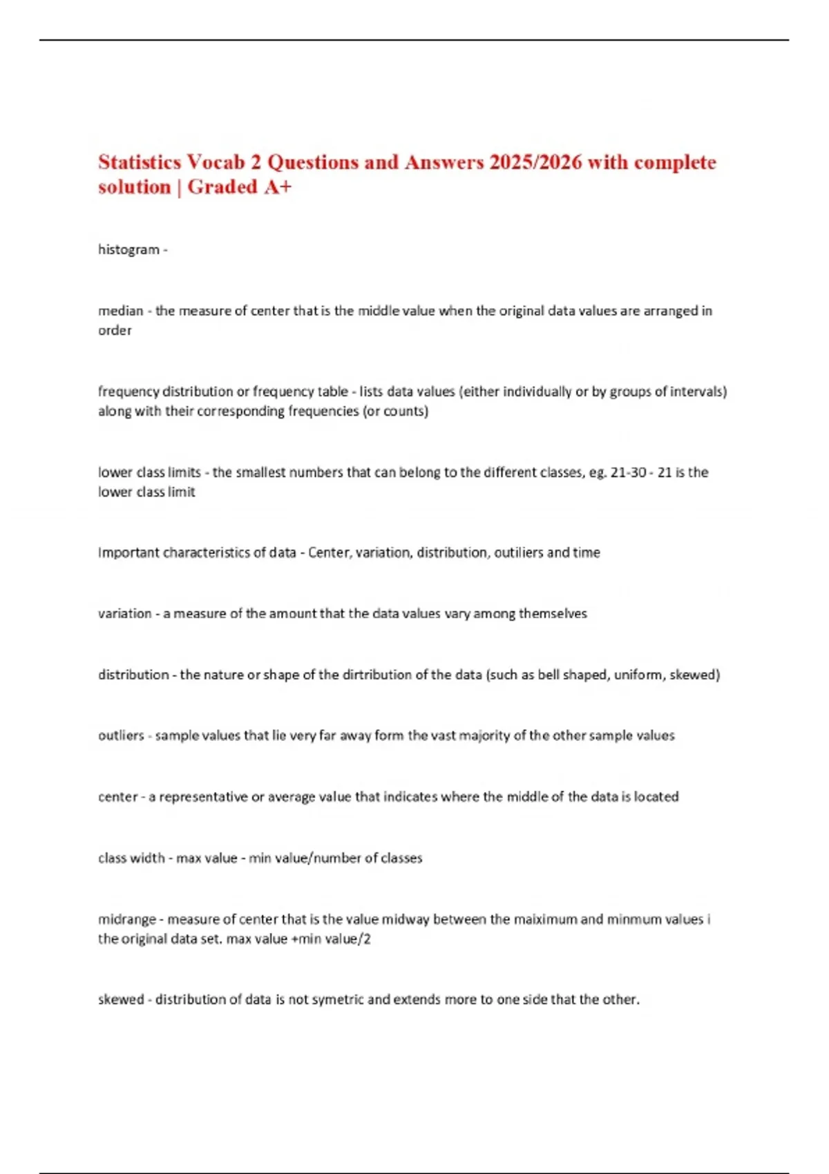 Statistics Vocab 2 Questions and Answers 2025/2026 with complete solution | Graded A+