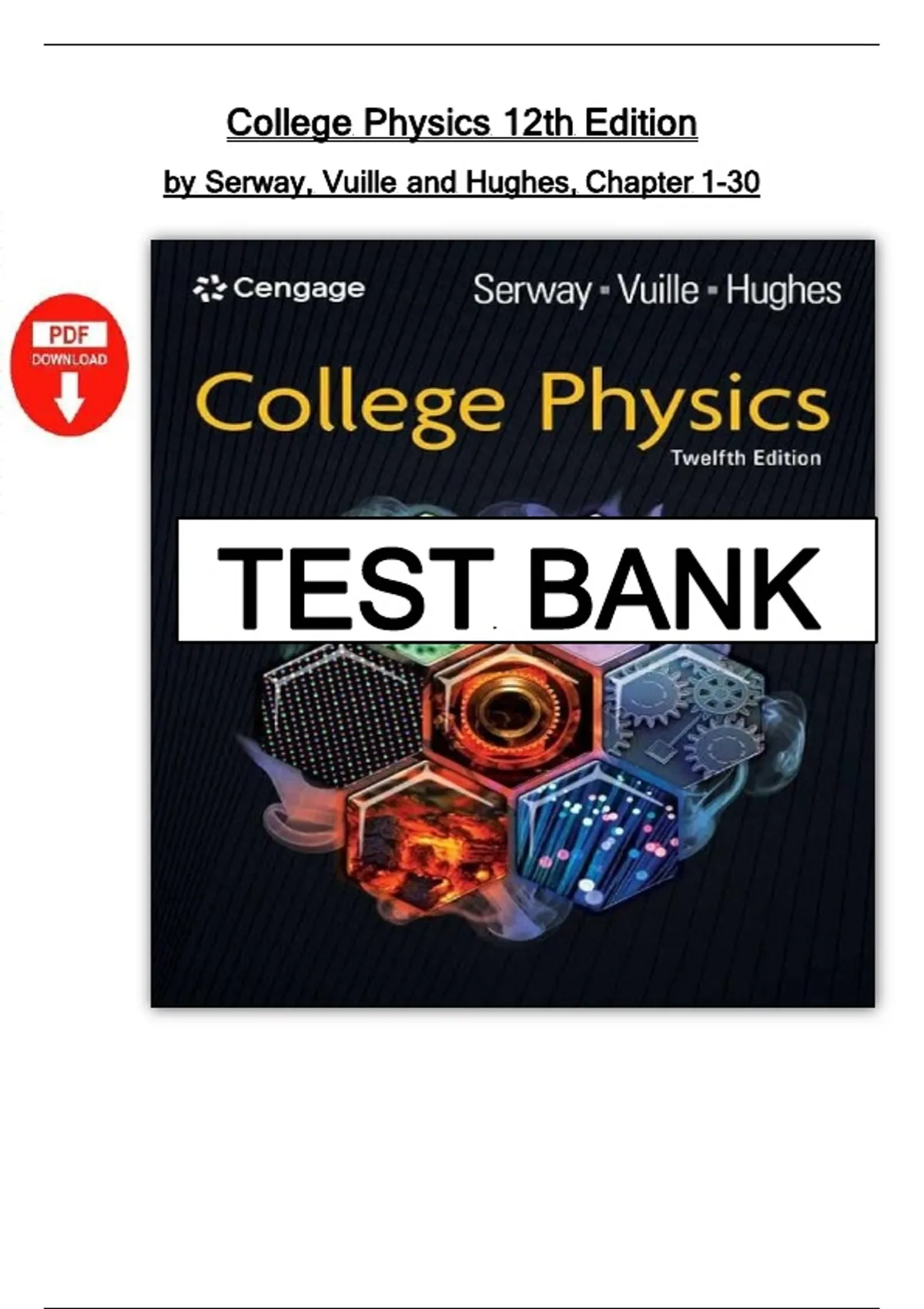 Complete study resource for College Physics, 12th Edition by Serway, Vuille, and Hughes, covering Chapters 1 through 30. Includes summaries, key concepts, and worked-out problems across mechanics, thermodynamics, electromagnetism, optics, and modern physics. Ideal for exam prep, homework support, and mastering core physics principles.