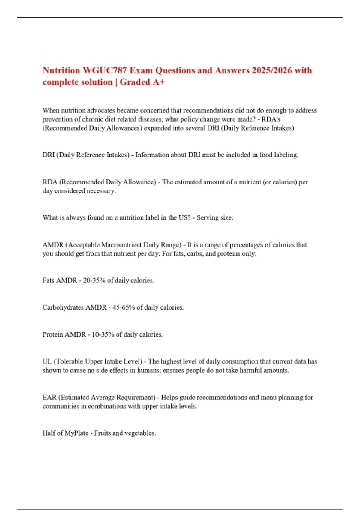 Nutrition WGUC787 Exam Questions and Answers 2025/2026 with complete solution | Graded A+