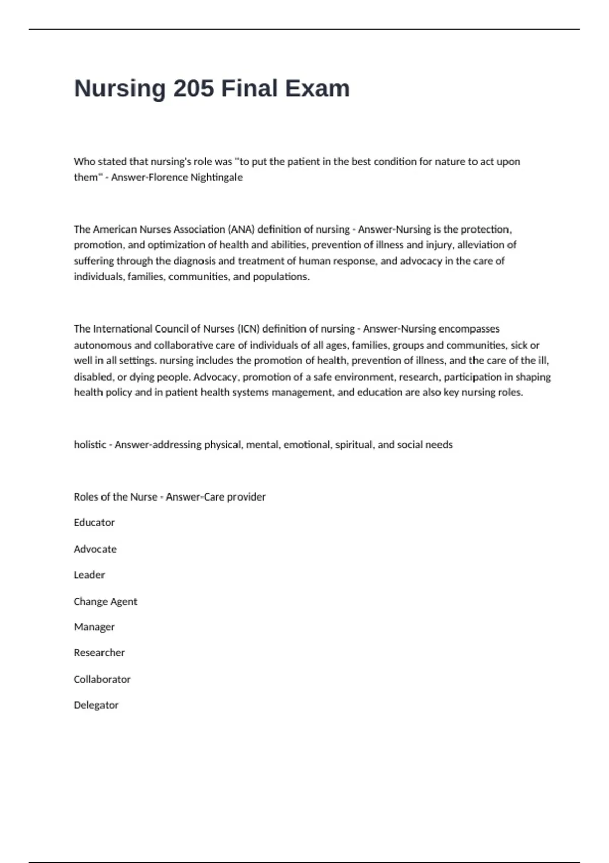 Nursing 205 Final Exam Questions and Answers |LATEST |UPDATED