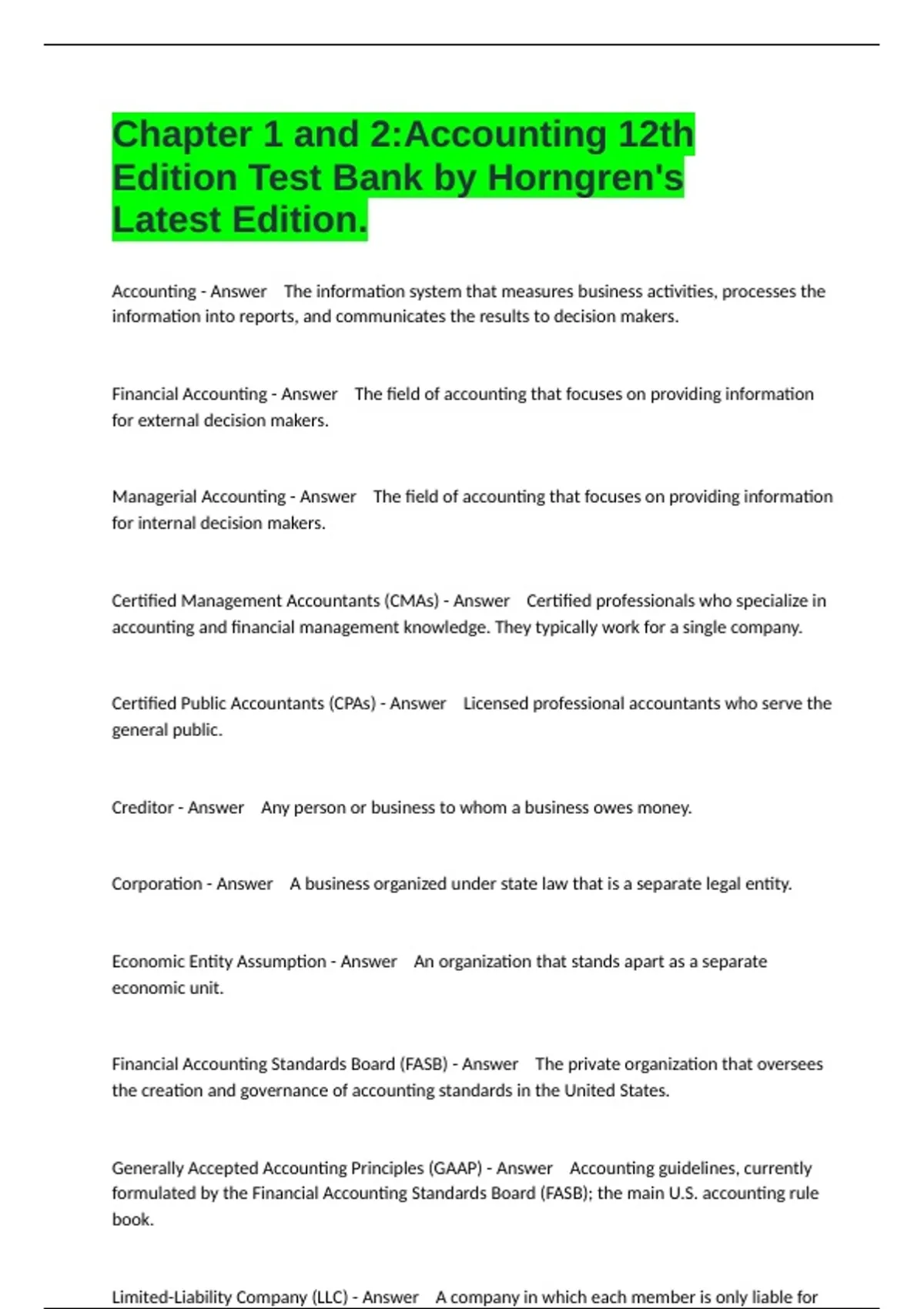 Chapter 1 and 2: Accounting 12th Edition Test Bank by Horngren's Latest Edition.