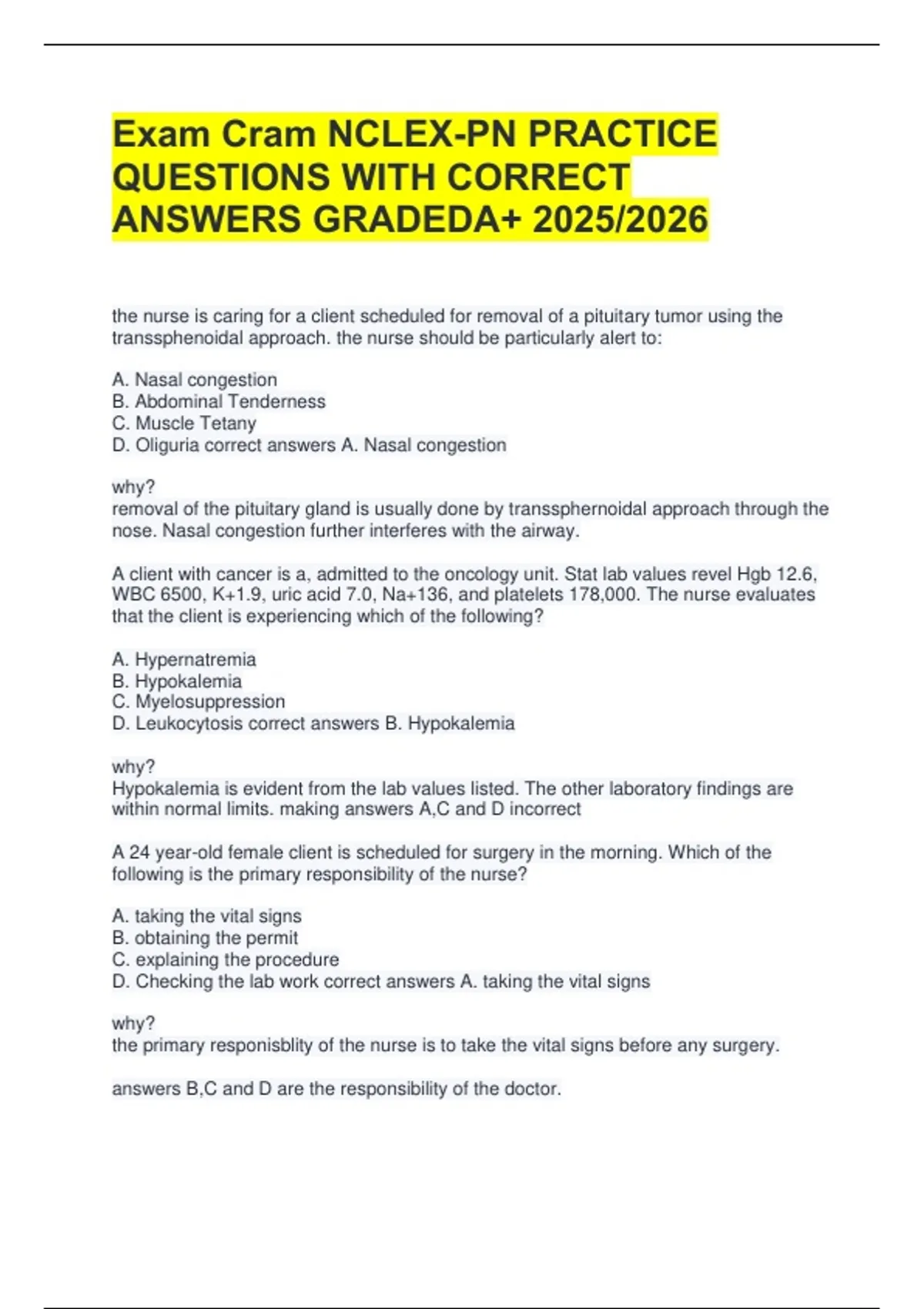 Exam Cram NCLEX-PN Practice Questions with Correct Answers (Graded A+) 2025/2026