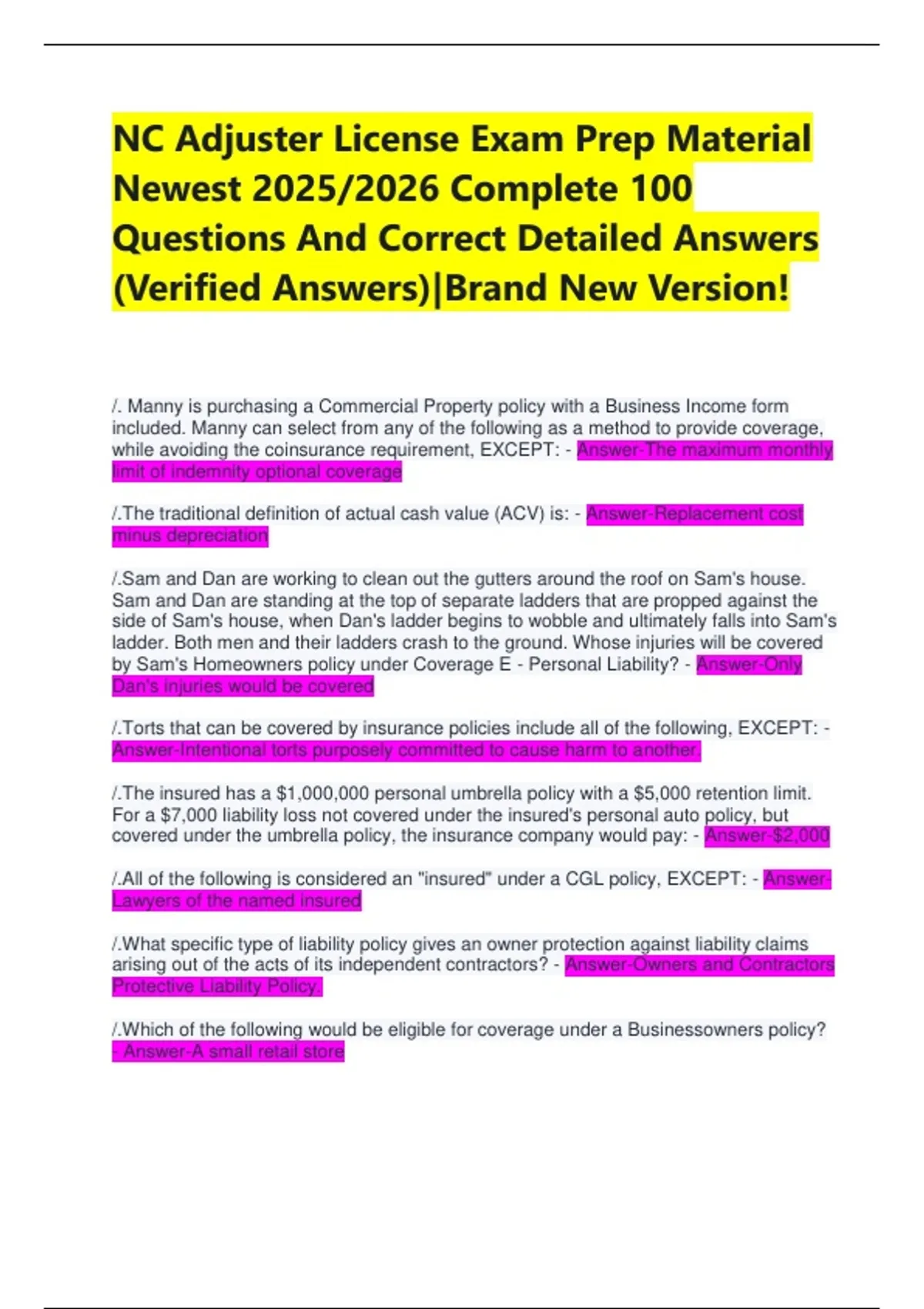NC Adjuster License Exam Prep Material Newest 2025/2026 Complete 100 Questions And Correct Detailed Answers (Verified Answers)|Brand New Version! /. Manny is purchasing a Commercial Property policy with a Business Income form included. Manny can select from any of the following as a method to provide coverage, while avoiding the coinsurance requirement, EXCEPT: - Answer-The maximum monthly limit of indemnity optional coverage /.The traditional definition of actual cash value (ACV) is: - Answer-Replacement cost minus depreciation /.Sam and Dan are working to clean out the gutters around the roof on Sam's house. Sam and Dan are standing at the top of separate ladders that are propped against the side of Sam's house, when Dan's ladder begins to wobble and ultimately falls into Sam's ladder. Both men and their ladders crash to the ground. Whose injuries will be covered by Sam's Homeowners policy under Coverage E - Personal Liability? - Answer-Only Dan's injuries would be covered /.Torts that can be covered by insurance policies include all of the following, EXCEPT: - Answer-Intentional torts purposely committed to cause harm to another. /.The insured has a $1,000,000 personal umbrella policy with a $5,000 retention limit. For a $7,000 liability loss not covered under the insured's personal auto policy, but covered under the umbrella policy, the insurance company would pay: - Answer-$2,000 /.All of the following is considered an "insured" under a CGL policy, EXCEPT: - Answer-Lawyers of the named insured /.What specific type of liability policy gives an owner protection against liability claims arising out of the acts of its independent contractors? - Answer-Owners and Contractors Protective Liability Policy. /.Which of the following would be eligible for coverage under a Businessowners policy? - Answer-A small retail store /.Which of the following is NOT a correct statement in determining the cost of a "comparable automobile" when a physical damage loss has a occurred? - Answer-The cost of a comparable automobile as determined by a computerized automobile valuation service that produces statistically valid fair market values within the United States market /.All of the following statements are TRUE of North Carolina automobile liability policies, EXCEPT - Answer-If the insured carries limits greater than the minimum financial responsibility limits required by state law, they are not required to carry Uninsured/Underinsured Motorists coverage. /.The basic limit for Coverage F -- Medical Payments of the standard Homeowners forms is: - Answer-$1,000 per person /.Oliver Dogwood was in an auto accident which destroyed his car. While investigating the accident, Adjuster Doright found that Mr. Dogwood paid $1,000 for the vehicle. After checking with others he found the same vehicle with an asking price of $1,700, a retail price of $2,150 and a dealer price of $1,750. What amount will Mr. Dogwood receive? - Answer-$2,150 /.When a claims representative is collecting information from a third-party claimant, which of the following is the information that should be obtained first? - Answer-The nature and extent of the injuries or property damage claimed. /.The Business Auto uses Symbol 7 to cover "specifically described autos" identified in the declarations. An auto acquired during the policy period will only be covered: - Answer-If the insured insures all of their vehicles with the company or it replaces a covered auto.. /.What coverage under the BOP automatically applies if a customer slips and falls on the named insured's premises, regardless of legal liability? - Answer-Medical expense coverage /.When an insurer is called upon to defend a suit under a CGL policy, the amount that can be paid for the defense costs is: - Answer-Not limited /.Any North Carolina lender in making or servicing real estate mortgage or deed of trust loans on one to four family residences must accept a binder as proof of insurance. The binder presented to the lender must include all of the following, EXCEPT - Answer-A sworn statement that the insurance will be kept in force. /.Which of the following statements is TRUE concerning Part A - Liability coverage on a standard Personal Automobile policy? - Answer-The coverage is provided only for accidents caused by those who are "insureds" under the policy..